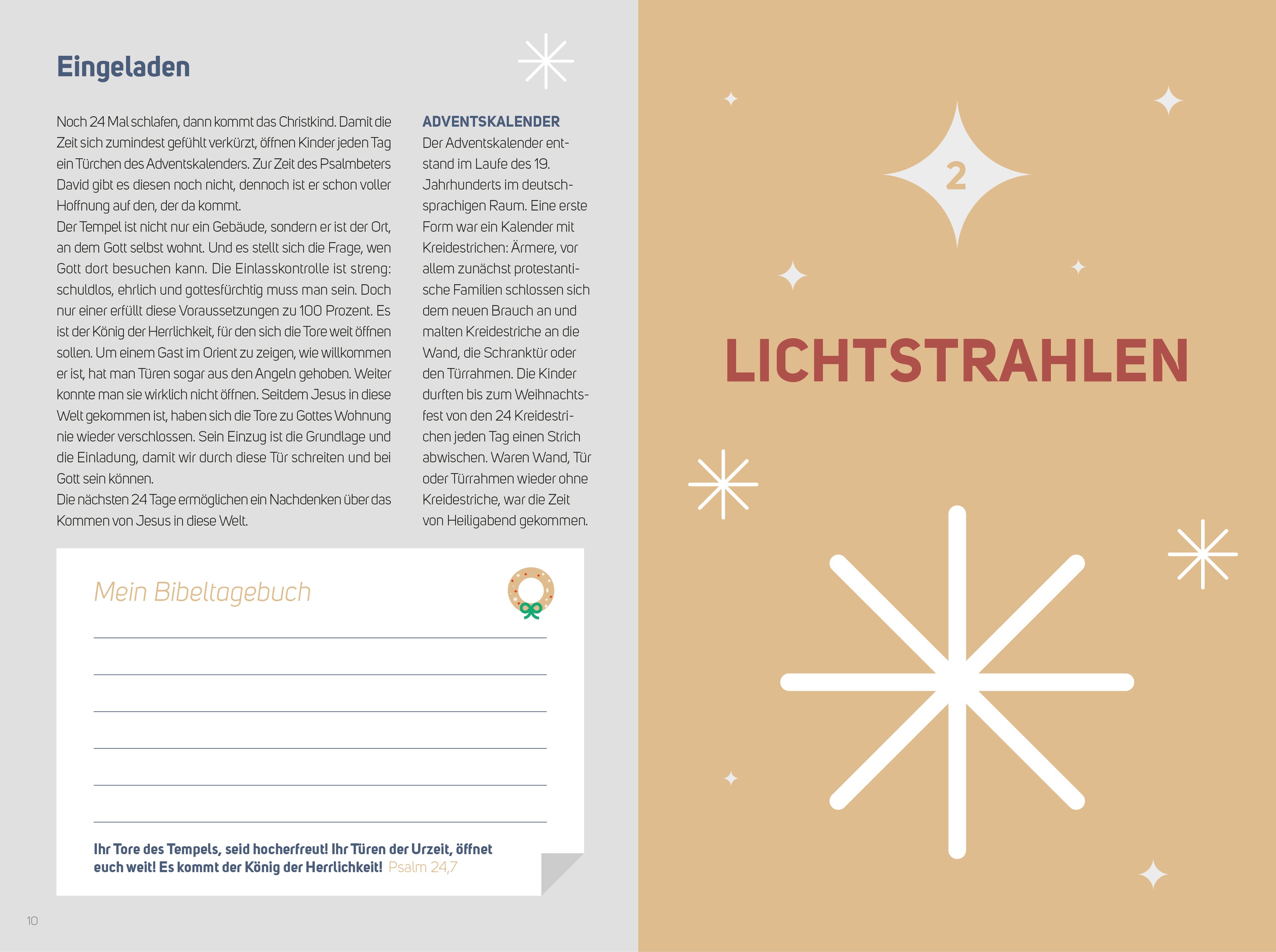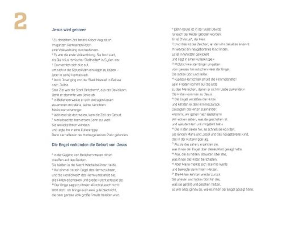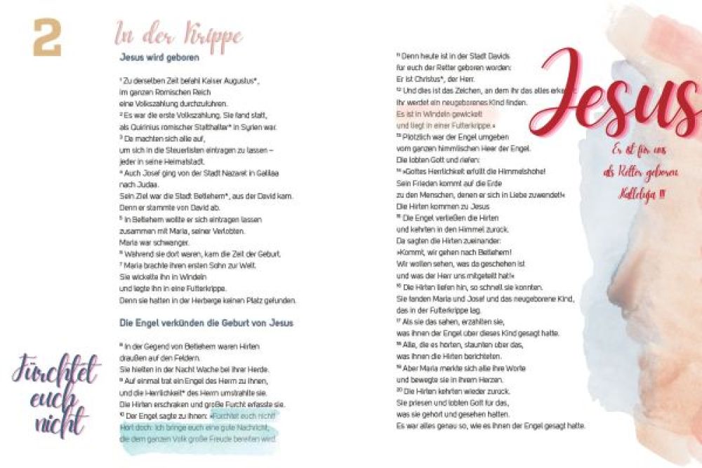Im Advent und zu Weihnachten steht die biblische Botschaft mehr als sonst im Mittelpunkt. Die Auseinandersetzung mit dem Bibeltext kann dabei viele kreative Ausdrücke finden. Das Bibeltagebuch Weihnachten lädt dazu ein, die Texte zu lesen und den eigenen Gedanken und Impulsen Ausdruck zu verleihen. Die 24 ansprechend gestalteten Einheiten mit Bibeltexten aus der BasisBibel geben viel Raum für eine kreative Auseinandersetzung. Neben Auszügen aus dem Lukas- und dem Matthäusevangelium sind auch weihnachtliche Texte aus dem Alten Testament enthalten.