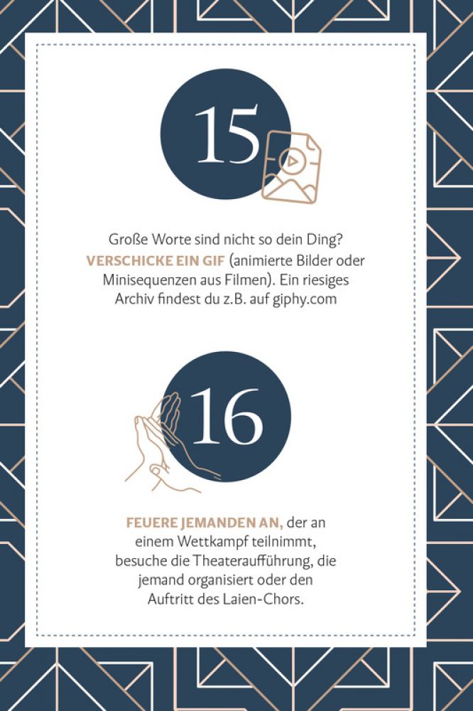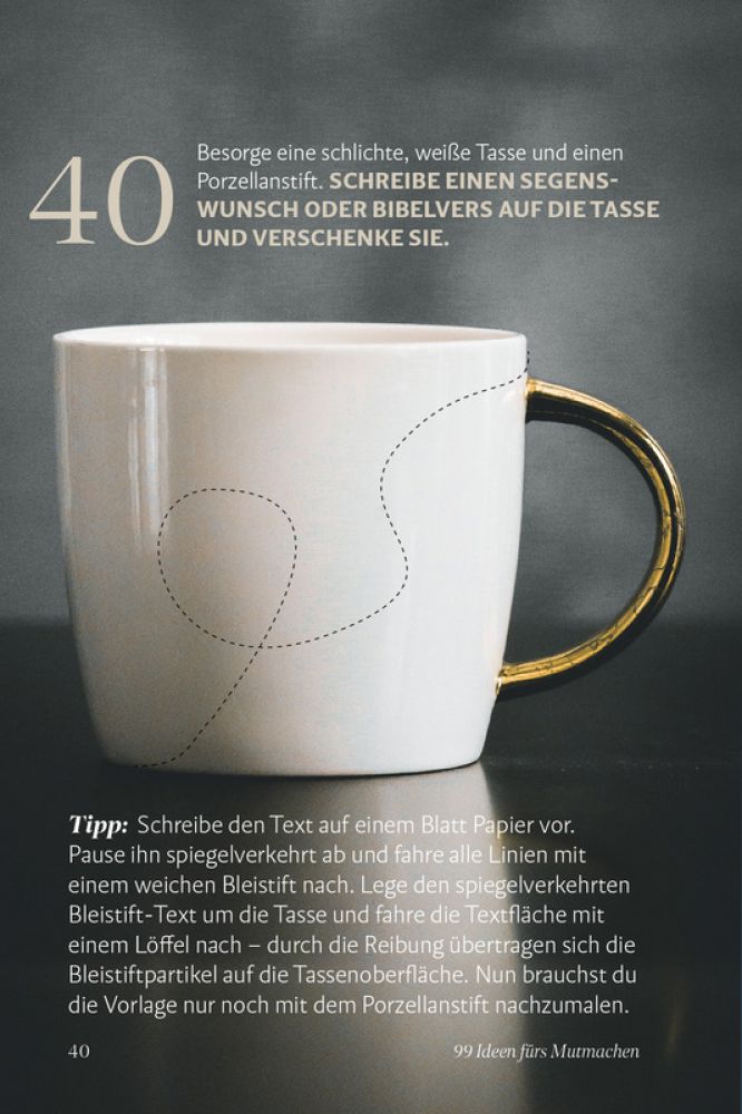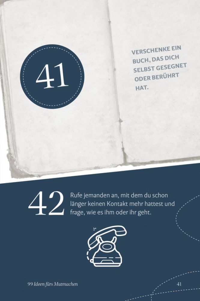 Jeder von uns braucht hin und wieder eine Portion Ermutigung, einen Zuspruch, der beflügelt oder eine kleine Aufmerksamkeit, die sagt "Ich denk an dich". Im Alltag fehlen einem jedoch oft entweder die passenden Ideen oder die richtigen Worte. Das ist künftig kein Problem mehr: In diesem Büchlein finden sich 99 Anregungen fürs Mutmachen, für unkomplizierte Aufmerksamkeiten und Worte, die einfach guttun.