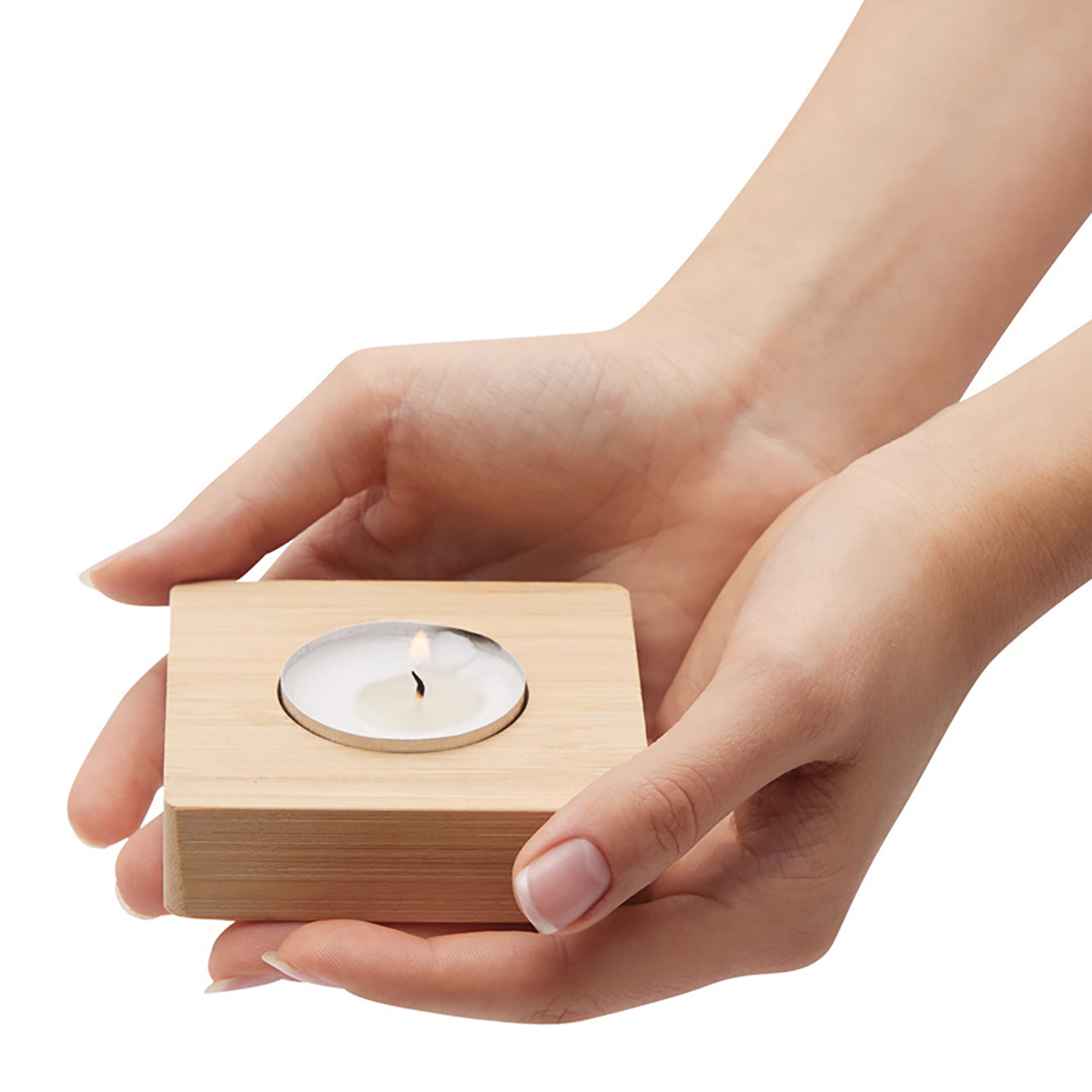 Teelichthalter aus Bambus mit Teelicht in einer gestalteten Banderole mit Widmungsmöglichkeit