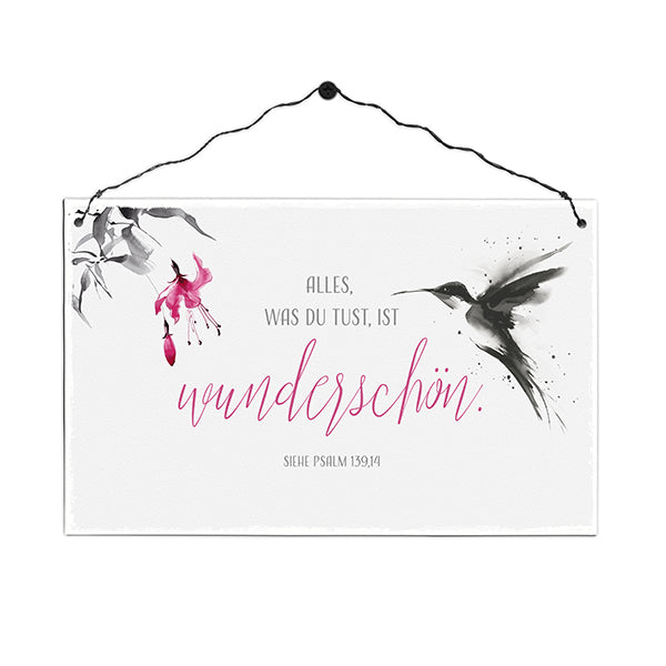 Mit doppeltem Draht zum Aufhängen und zusätzlicher Aufstellmöglichkeit. Es wird ein Holzstift mitgeliefert, der zum Aufstellen einfach auf der Rückseite angebracht werden kann.