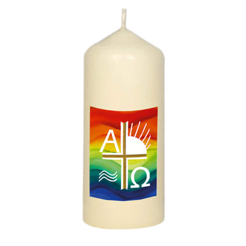 Schöne Ostertischkerze, die nicht nur zum Osterfest ein Hingucker ist. Die Osterkerze ist ein Zeichen für Ewiges Leben und dafür, dass Jesus von den Toten auferstanden ist. Verziert ist die Kerze im Transferdruck. Abgebildet sind der erste und der letzte Buchstabe des griechischen Alphabetes "Alpha und Omega" (Anfang und Ende).