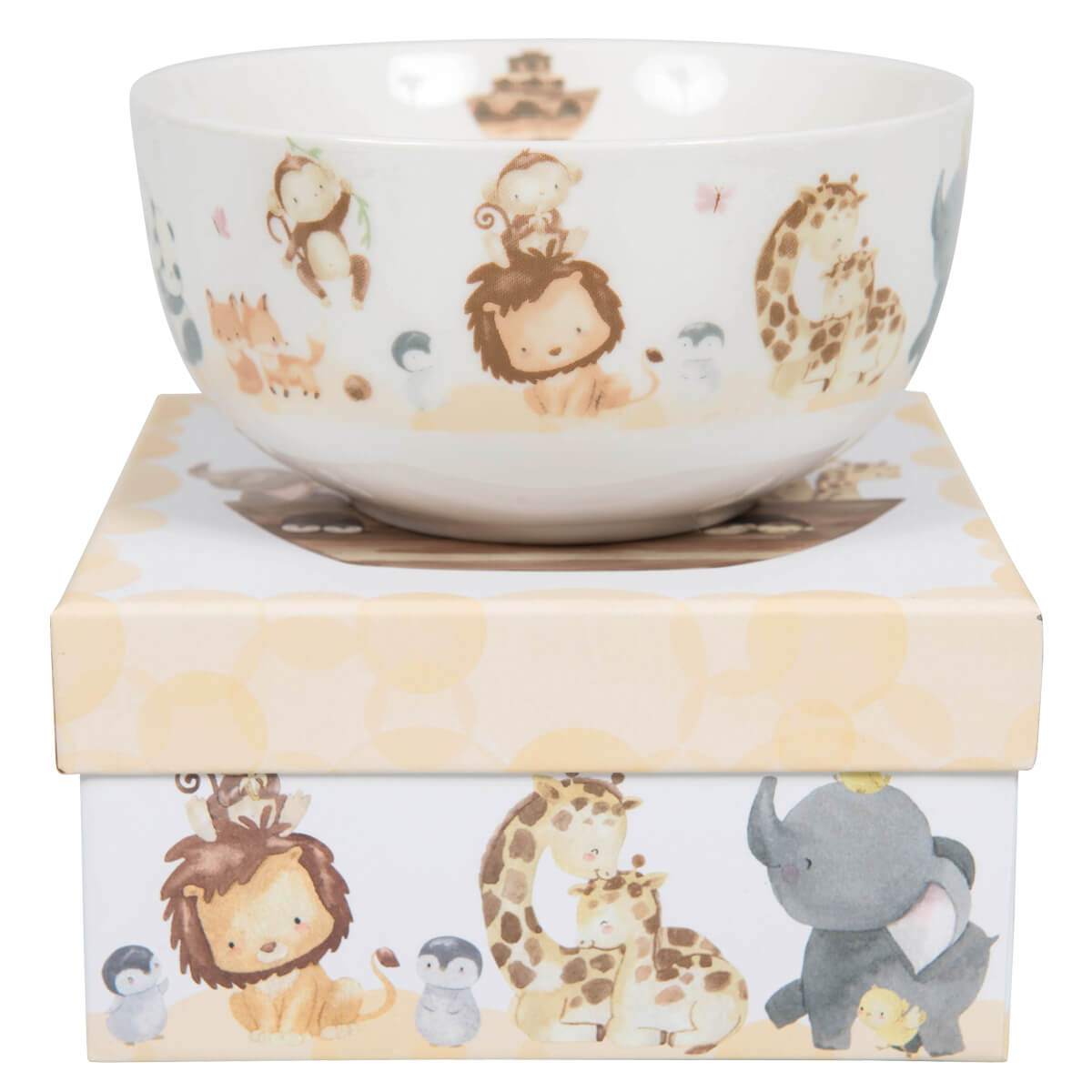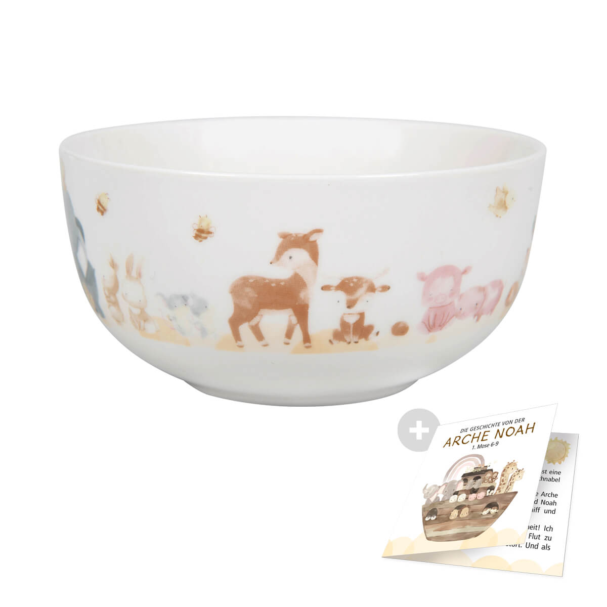 Müslischale "Arche Noah" mit wunderschönen Tiermotiven und im Schaleninneren die Abbildung der Arche Noah.