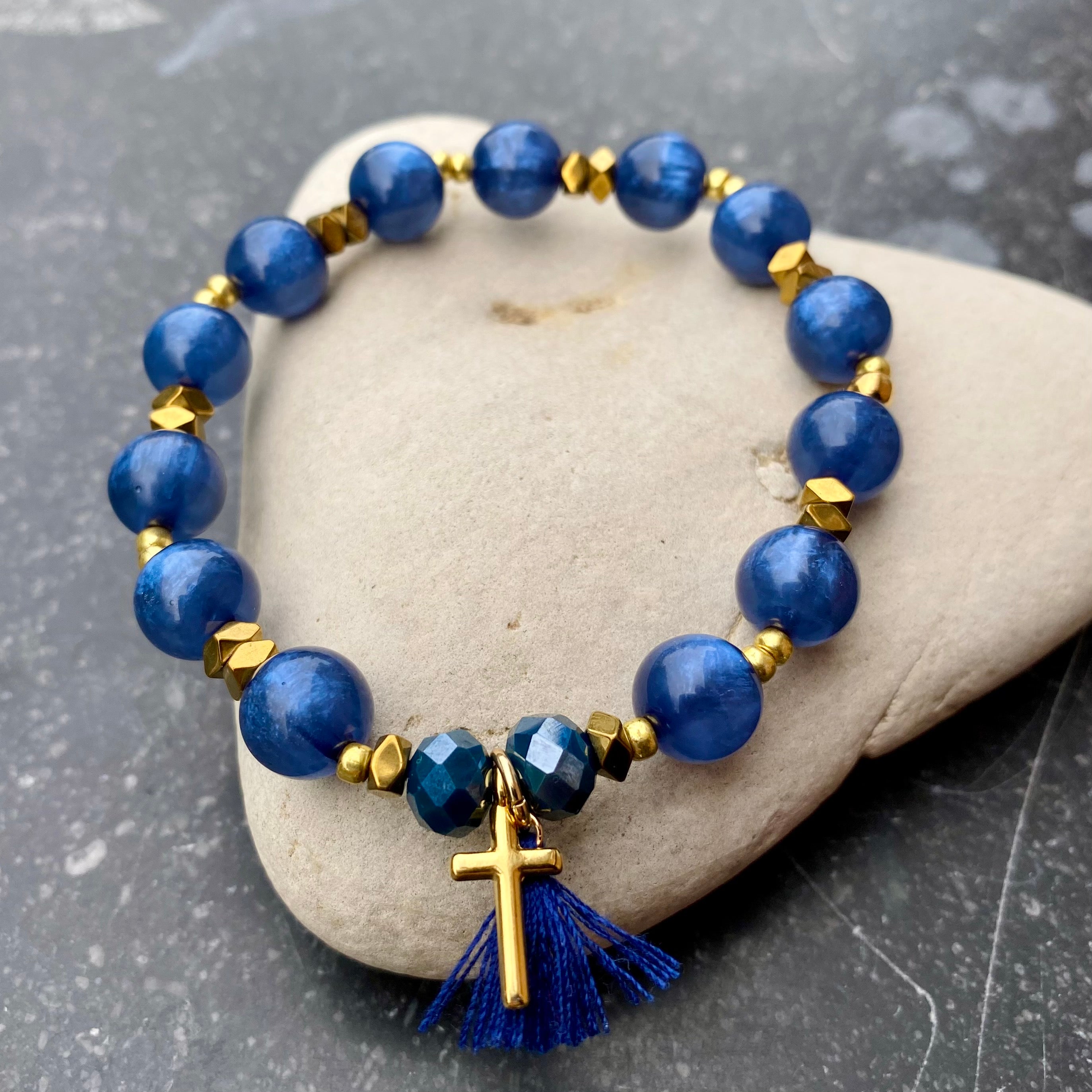 Das Armband "Gilla" besteht aus italienischen Polarisperlen, eckigen Eisenglanz-Perlen in Blau und goldfarbene Rocailles und wird durch ein feines, kleines Kreuz und eine blaue Quaste aus Baumwolle ergänzt. Eisenglanz ist übrigens auch als Hämatit bekannt: Ein Edelstein, der so stark glänzt, wie kein anderer!