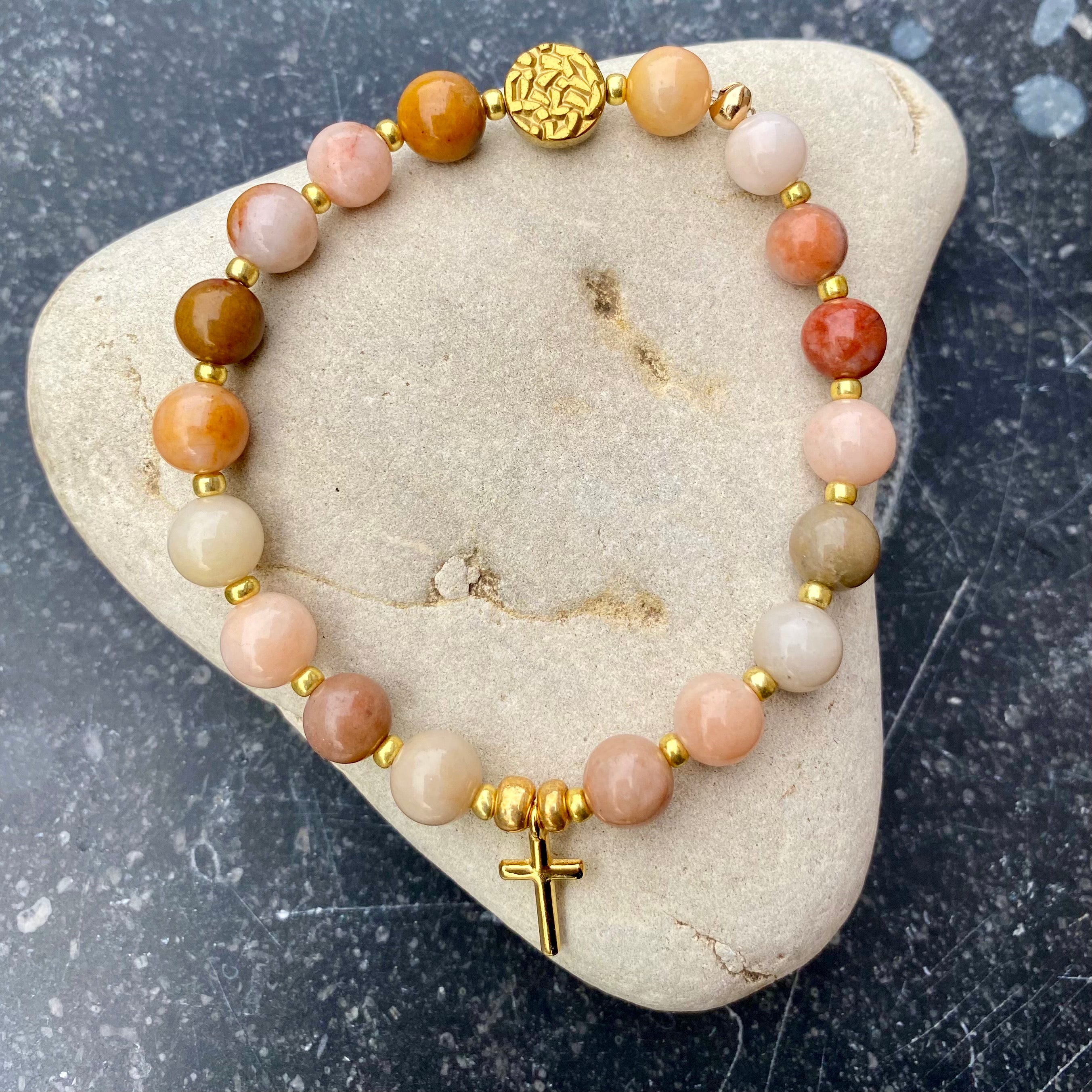 Ein klassisches Armband aus marmorierten Natursteinen (Achat-Perlen) in Beige-Rosé Tönen mit goldenen Rocailles. Es ist mit einer Eisenglanz-Münze und einem Kreuz-Anhänger in gold verziert.