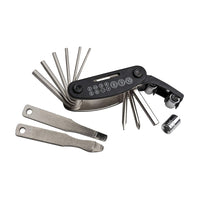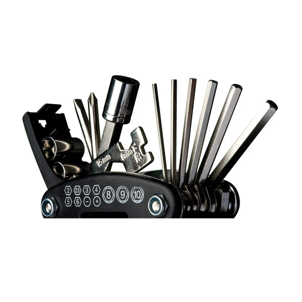 Es beinhaltet folgende Werkzeuge: Innen-Sechskantschlüssel: 2 / 2,5 / 3 / 4 / 5 / 6 mm, Steckschlüsseleinsätze: 8 / 9 / 10 mm und Steckschlüssel, Schlitz- und Kreuzschraubendreher und flache Maulschlüssel 8 / 10 / 15 mm, 14GE-Speichenspanner, Reifenheber und Reifenflickzeug.
