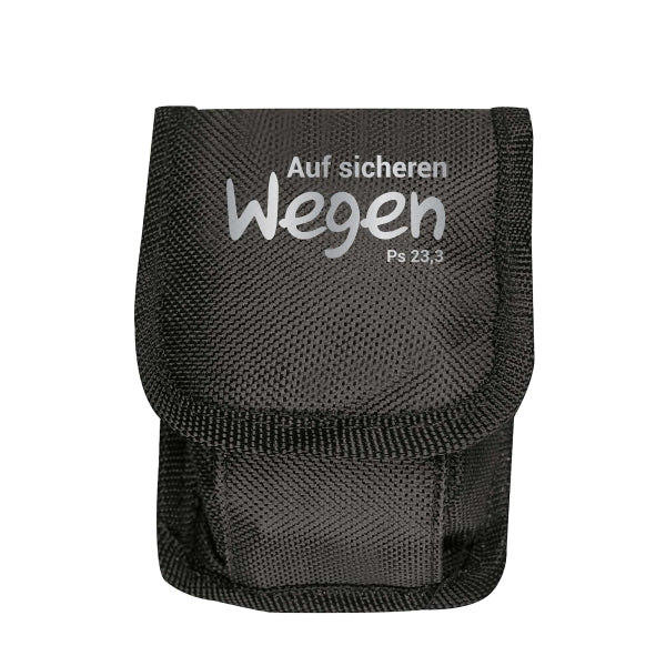 Das handliche Tool lässt sich platzsparend zusammenfalten und in der mitgelieferten Tasche mittels Schlaufe an der Taschenrückseite mühelos z. B. am Gürtel befestigen. Veredelt ist das Multitool mit dem Druck "Auf sicheren Wegen - Ps 23,3".