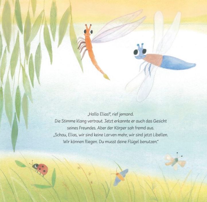 Elias, die Libellenlarve, lebt mit seinen Freunden in einem schönen See. Verwundert beobachtet er, wie die älteren Larven eine nach der anderen verschwinden: Sie durchdringen die Wasseroberfläche und keiner weiß, was dann mit ihnen geschieht. Elias nimmt sich vor, dass er zurückkommen und seinen Freunden davon berichten wird, wenn er das Wasser verlassen muss. Doch dann kommt alles anders