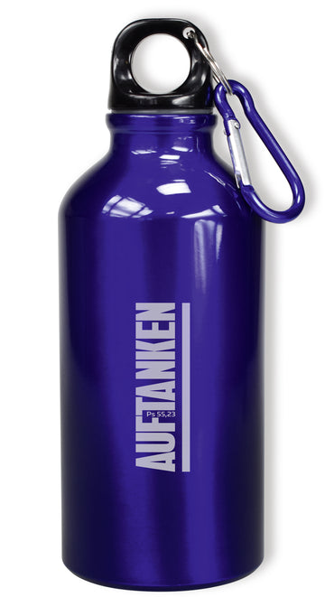 Trinkflasche aus Aluminium mit Schraubverschluss und Karabiner, 0,4 ltr., mit Text "Auftanken"