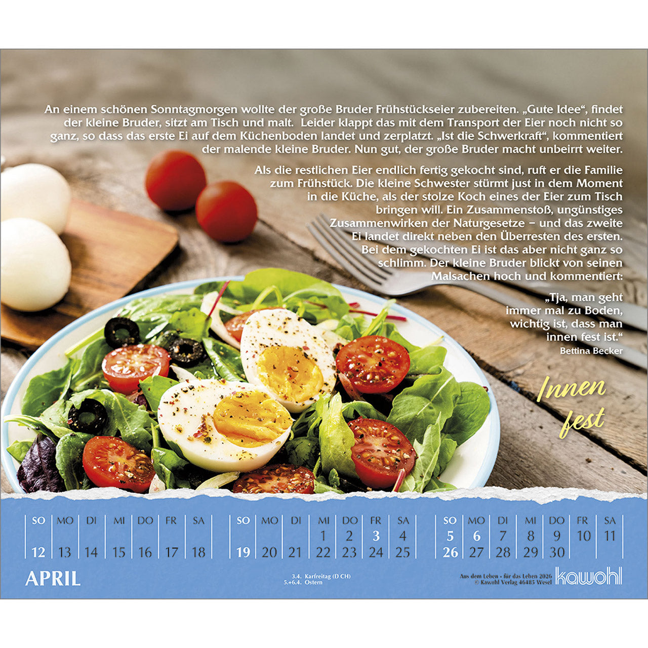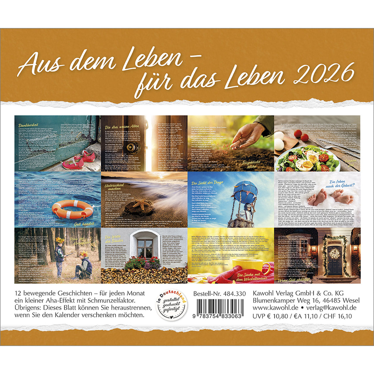 Jedes Kalenderblatt erzählt eine bewegende Kurzgeschichte aus dem Alltag, die uns manches praktisch verständlich macht. Einprägsame Beispielerzählungen sind verbunden mit symbolstarken Bildern. Erfreuendes und Nachdenkliches für Leser und Betrachter aller Altersgruppen.