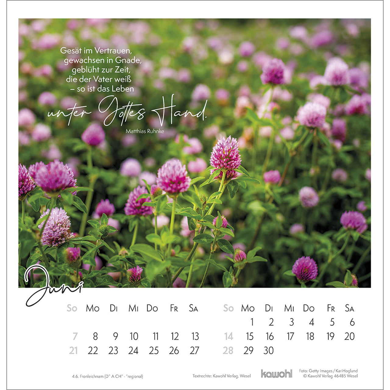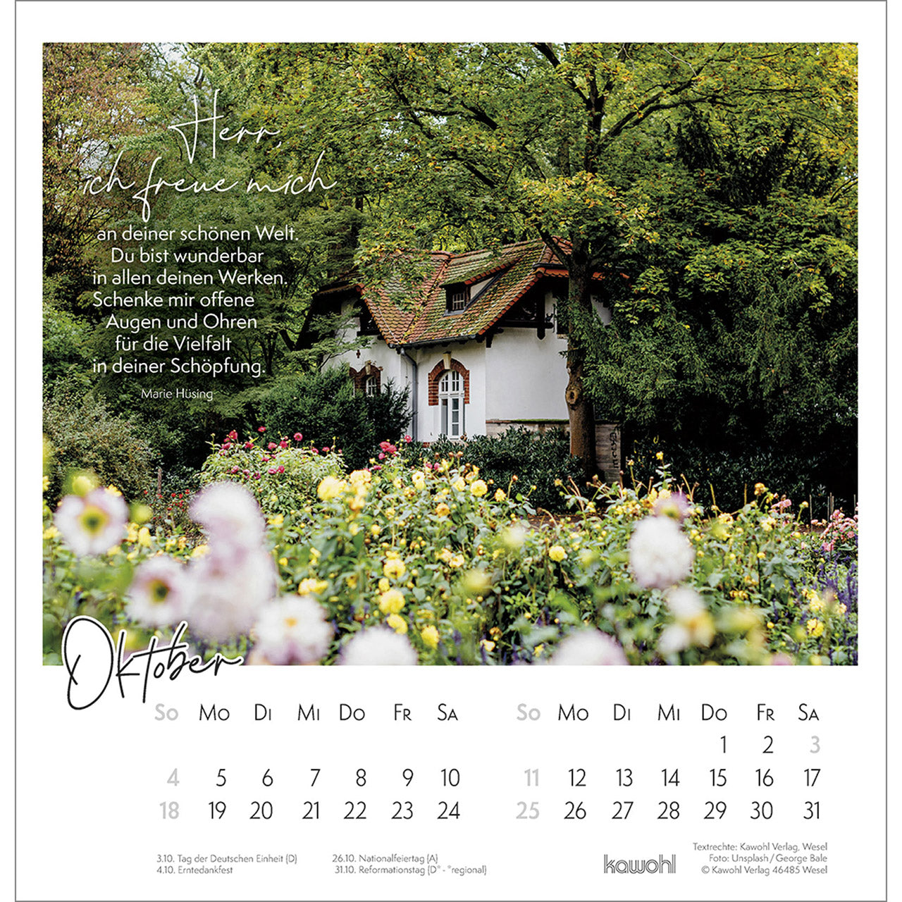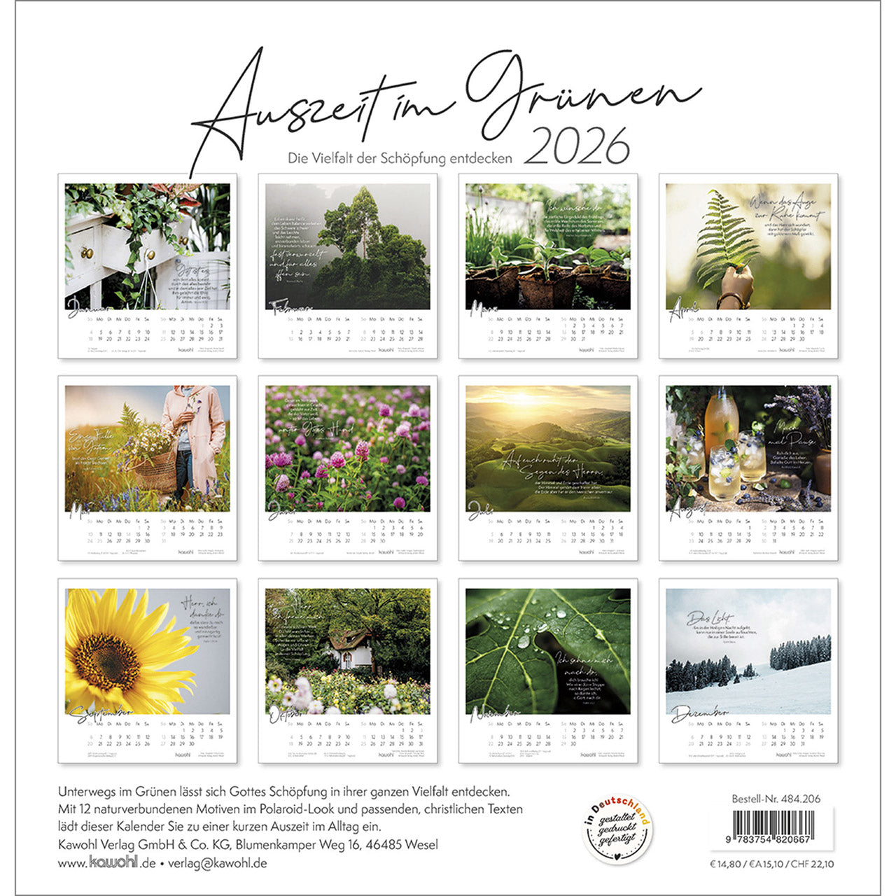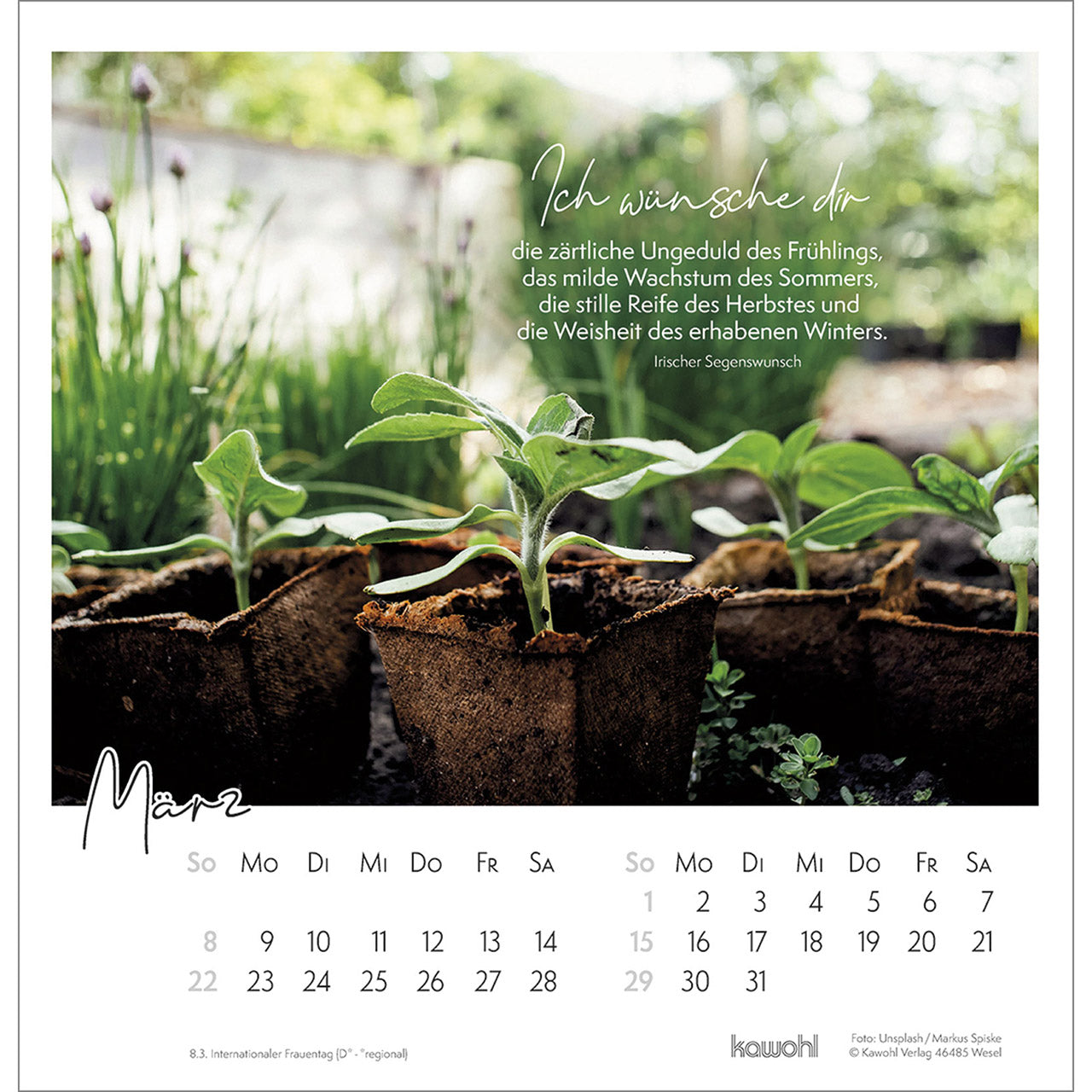 Schönes Wetter, die Luft riecht frisch. Die Sonne scheint. Der ideale Zeitpunkt für einen Ausflug in die Natur. Der Kalender "Auszeit im Grünen" bringt Ihnen ein wenig davon in Ihre eigenen vier Wände.