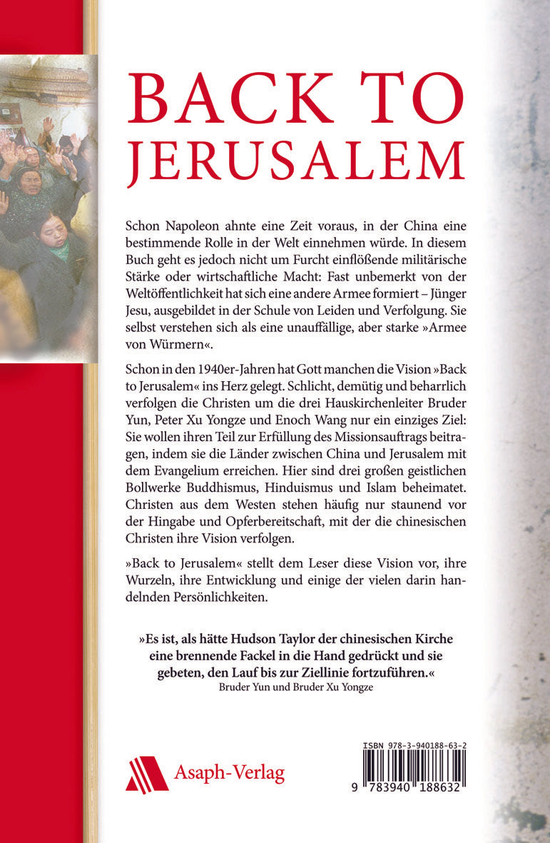 Schon Napoleon ahnte eine Zeit voraus, in der China eine bestimmende Rolle in der Welt einnehmen wird. In diesem Buch geht es jedoch nicht um Furcht einflößende militärische Stärke oder wirtschaftliche Macht. Fast unbemerkt von der Weltöffentlichkeit hat sich eine Armee formiert, die sich selbst als eine "Armee von Würmern" versteht - in der Schule von Leiden und Verfolgung ausgebildete Jünger Jesu. Einigen hat Gott schon in den 1940er-Jahren die Vision "Back to Jerusalem" ins Herz gelegt. Schlicht, demütig und beharrlich verfolgen diese Christen um die drei Hauskirchenleiter Bruder Yun, Peter Xu Yongze und Enoch Wang nur ein einziges Ziel: Sie wollen ihren Teil zur Erfüllung des Missionsauftrags beitragen, indem sie die Länder zwischen China und Jerusalem, die die drei großen geistlichen Bollwerke Buddhismus, Hinduismus und Islam beheimaten, mit dem Evangelium erreichen. Und dies tun sie mit einer Hingabe und Opferbereitschaft, die Christen aus dem Westen nicht selten staunen lässt.