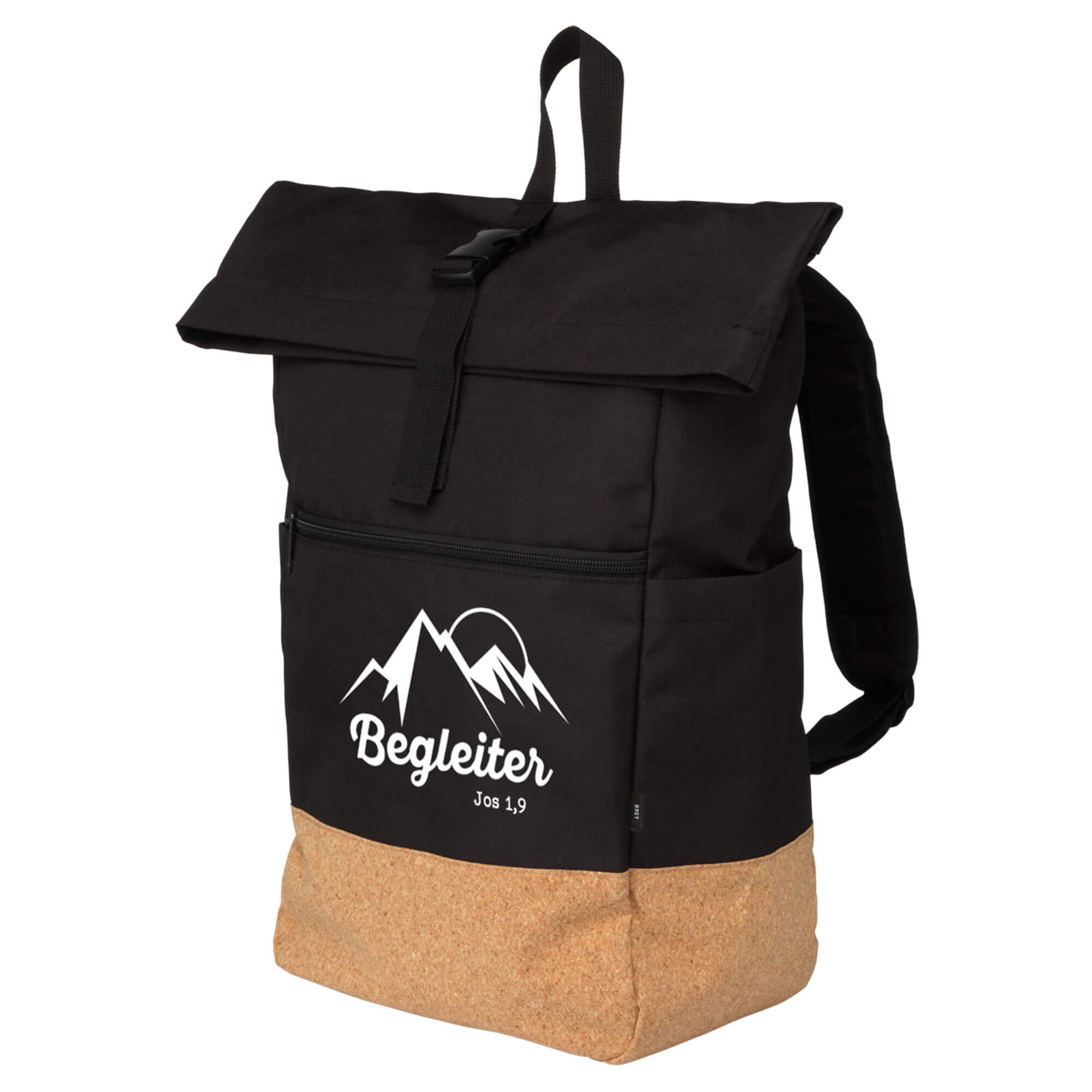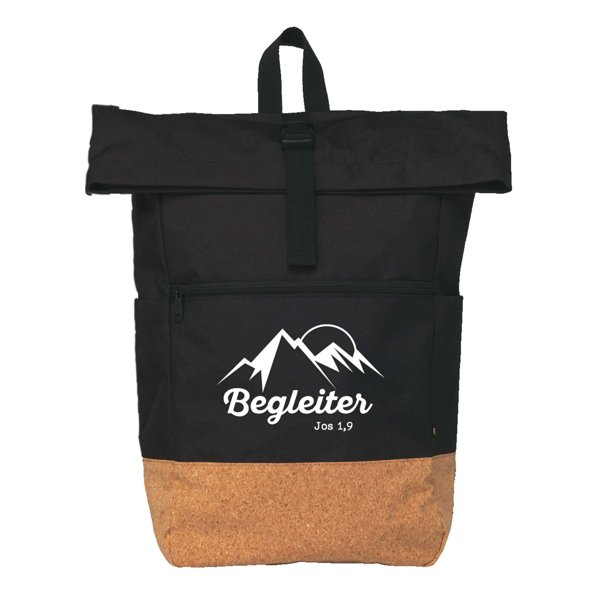Mit Trageschlaufe, aufrollbarem Verschluss und praktischem Klicksystem an der Oberseite. Bedruckt ist der Rucksack mit "Begleiter - Jos 1,9" und einem schönen Outdoor-Motiv.