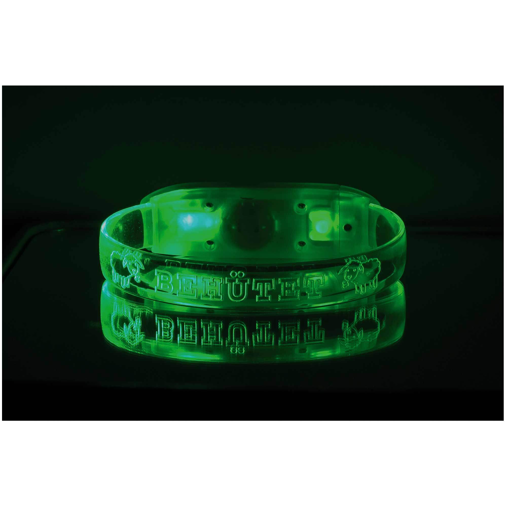 Insgesamt stehen 4 verschiedene Armbandfarben und 3 verschiedene Licht-Modi zur Auswahl: langsames und schnelles Blinken sowie Dauerleuchten.