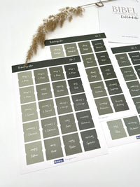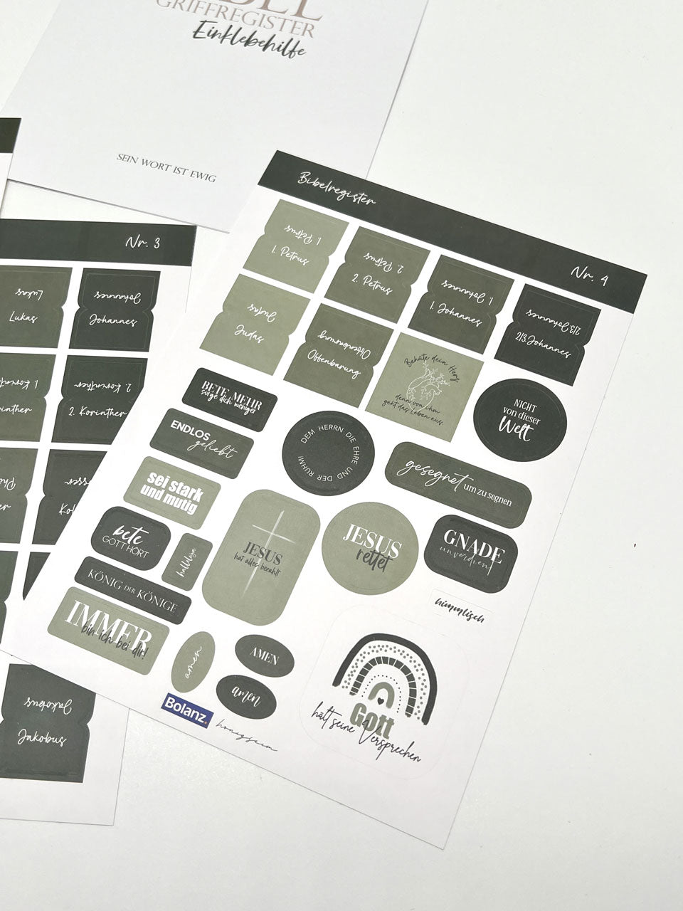- 4 Stickerbögen mit allen Bücher der Bibel (ohne Apokryphen)