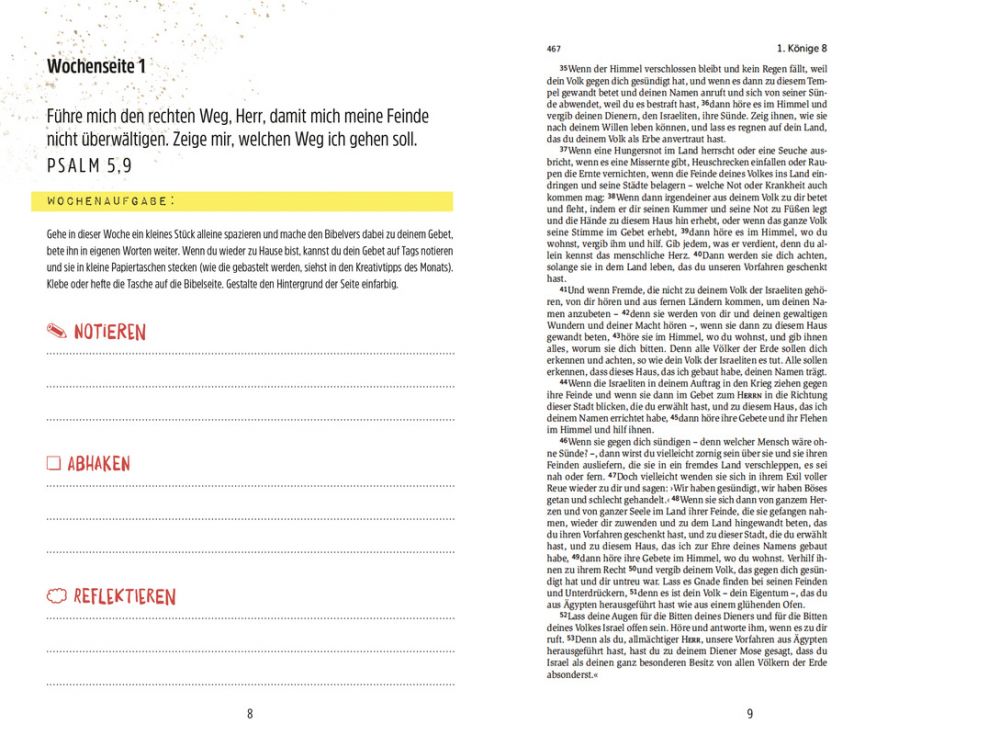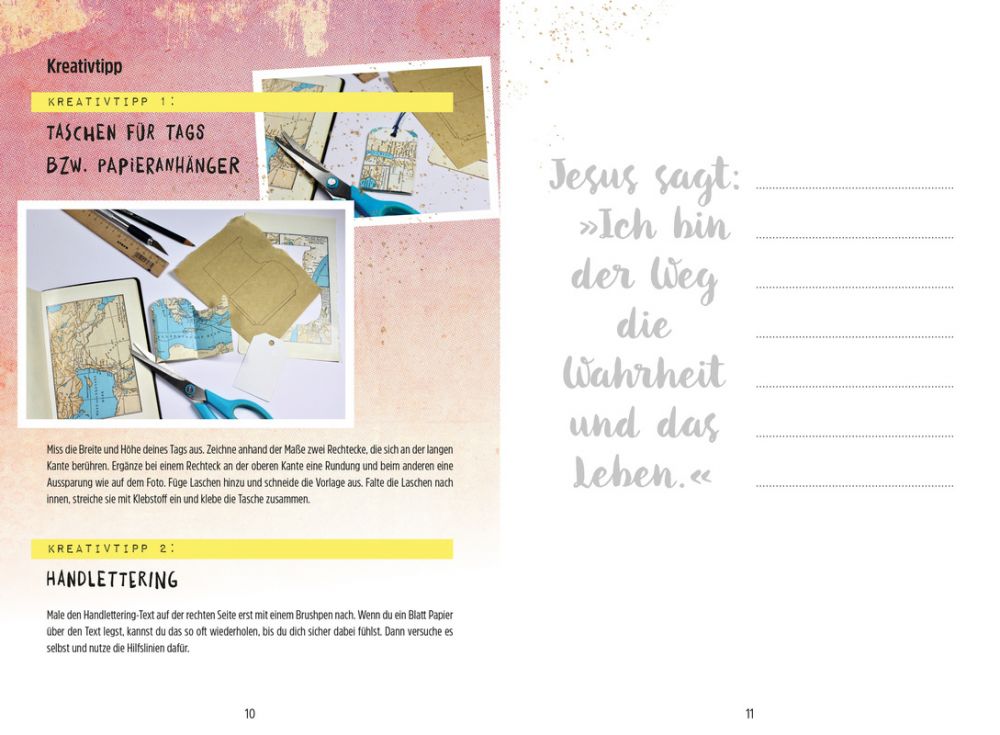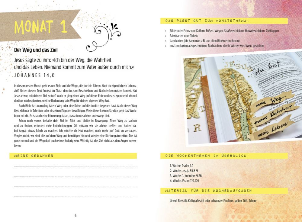Von der Freude, Bibelverse kreativ zu gestalten! Wer endlich mit dem Bible Art Journaling beginnen möchte oder seine kreativen Fähigkeiten erweitern und den eigenen Stil finden will, der liegt mit diesem Workbook genau richtig. Praktische Übungen, kreative Projekte und inhaltliche Impulse werden zum Begleiter durch den Alltag. 12 Monatsthemen mit je vier Wochenprojekten sorgen dafür, dass jeder seinen eigenen Bible Art Journaling-Stil findet. Das Buch kann jederzeit begonnen und im eigenen Tempo durchgearbeitet werden. Mit vielen Bibelseiten, die direkt im Buch gestaltet werden können.