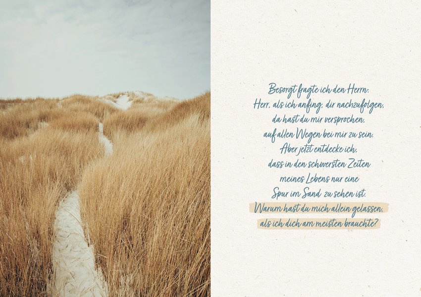 Das bekannte Gedicht "Spuren im Sand" von Margaret Fishback Powers hat schon vielen Menschen in aller Welt Ermutigung geschenkt. Sein Kerngedanke "Wo du nur eine Spur gesehen hast, da habe ich dich getragen" ist ein großartiges Versprechen Gottes an uns.