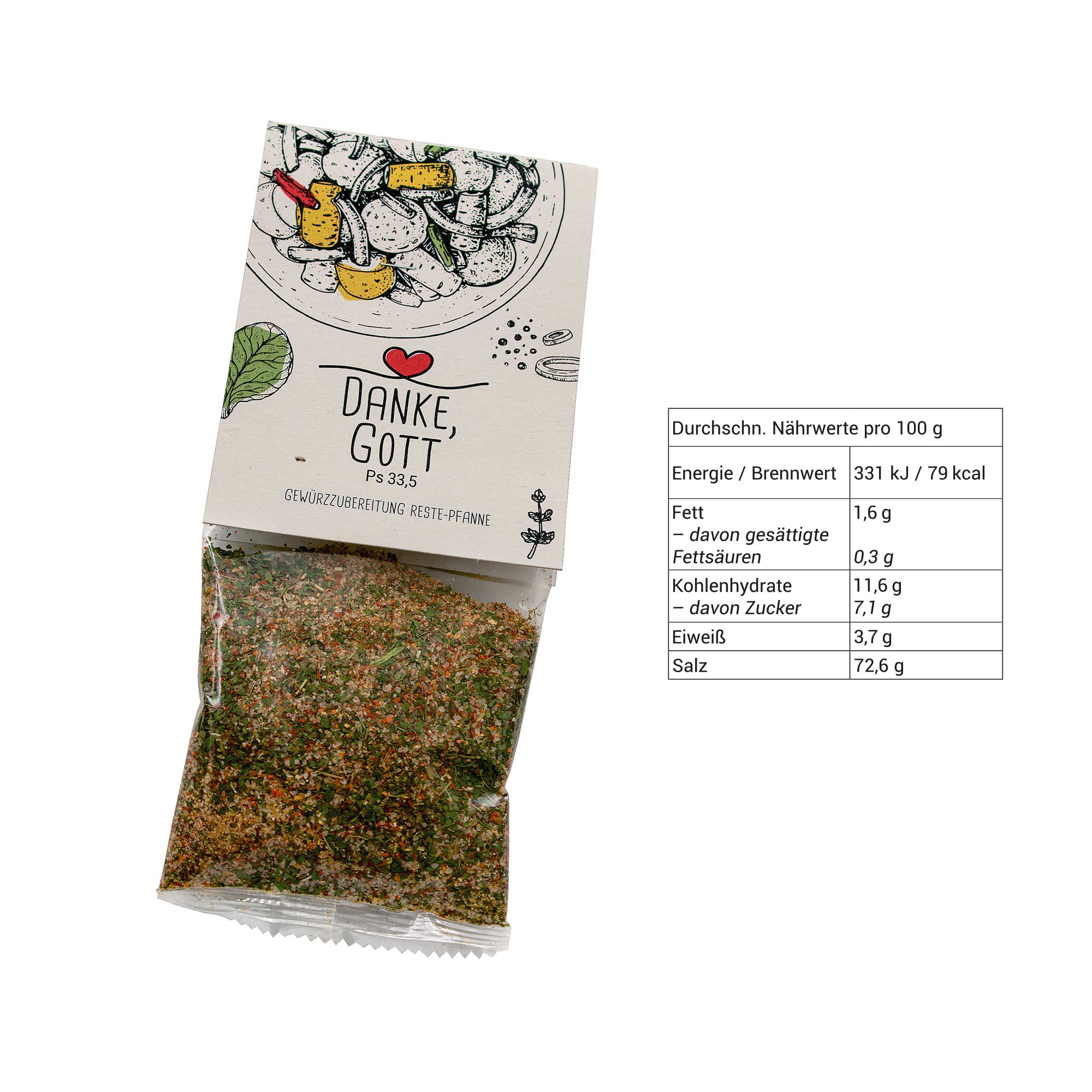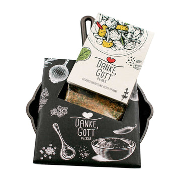 Eine besondere Geschenkidee und ideal als Mitbringsel beim Besuch bei Freunden ist die kleine Pfanne mit Ausgießern, inkl. Gewürzzubereitung und Rezept. Darin ist alles enthalten, was zur Resteverwertung benötigt wird.