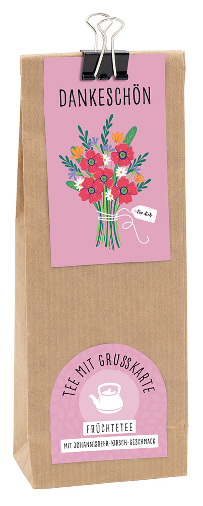 75 g Früchtetee mit Johannisbeer-Kirsch-Geschmack, mit Grußkarte und Klammer