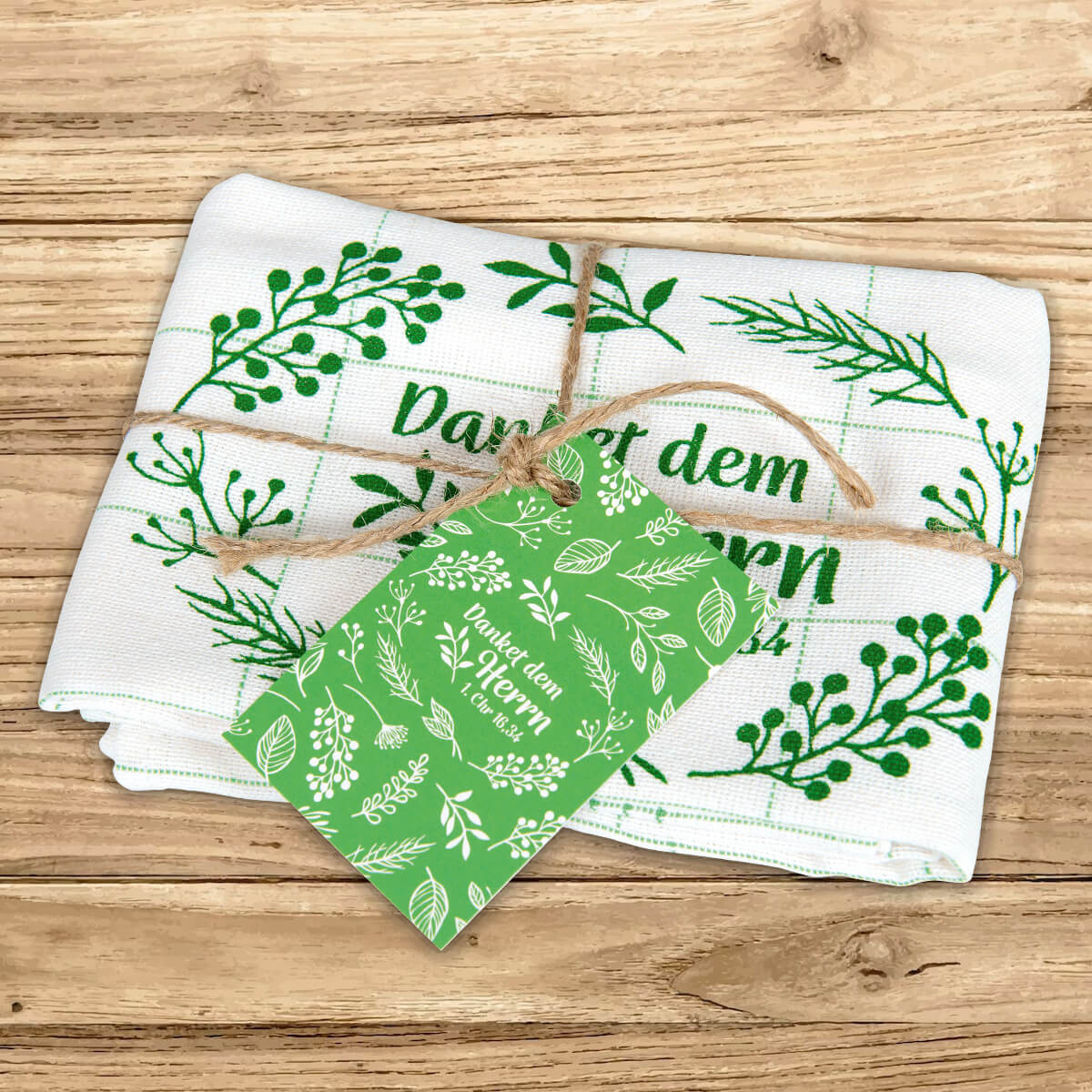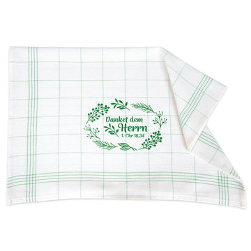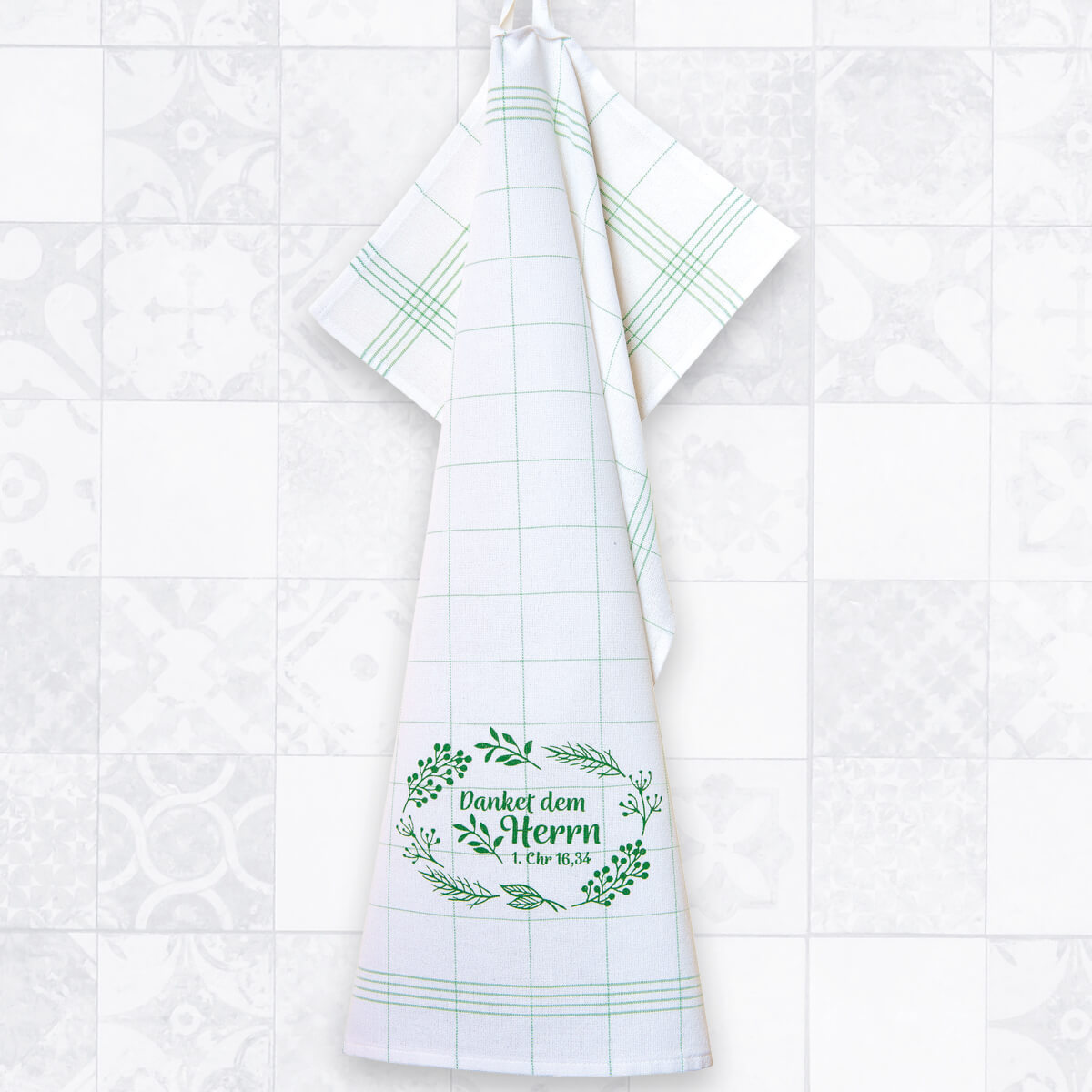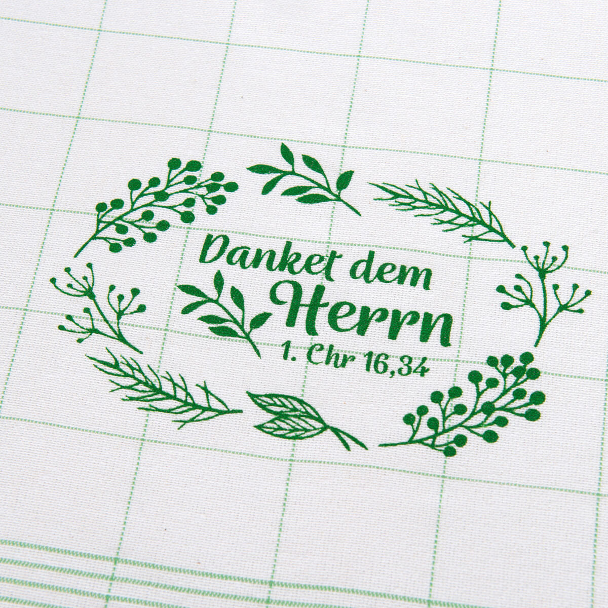 Grün kariertes Geschirrtuch aus 100 % Baumwolle, einfarbig bedrucktmit dem Text: Danket dem Herrn.