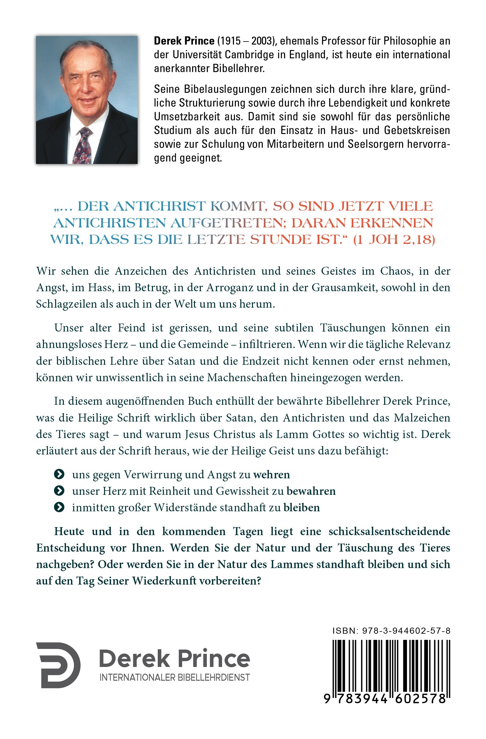 In diesem augenöffnenden Buch enthüllt der bewährte Bibellehrer Derek Prince, was die Heilige Schrift wirklich über Satan, den Antichristen und das Malzeichen des Tieres sagt und warum Jesus Christus als Lamm Gottes so wichtig ist. Derek erläutert aus der Schrift heraus, wie der Heilige Geist uns dazu befähigt: