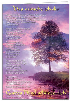 Das wünsche ich dir: Mögen sich die Wege vor deinen Füßen ebnen, mögest du den Wind im Rücken haben, möge die Sonne warm dein Gesicht bescheinen, möge Gott seine schützende Hand über dir halten. Mögest du in deinem Herzen dankbar bewahren die kostbare Erinnerung der guten Dinge in deinem Leben. Das wünsche ich dir, dass jede Gottesgabe in dir wachse und sie dir helfe, die Herzen jener froh zu machen, die du liebst. Möge freundlicher Sinn glänzen in deinen Augen, anmutig und edel wie die Sonne, die, aus den Nebeln steigend, die ruhige See wärmt. Gottes Macht halte dich aufrecht, Gottes Auge schaue für dich, Gottes Ohr höre dich, Gottes Wort spreche für dich. Gottes Hand schütze dich. Altirische Segenswünsche