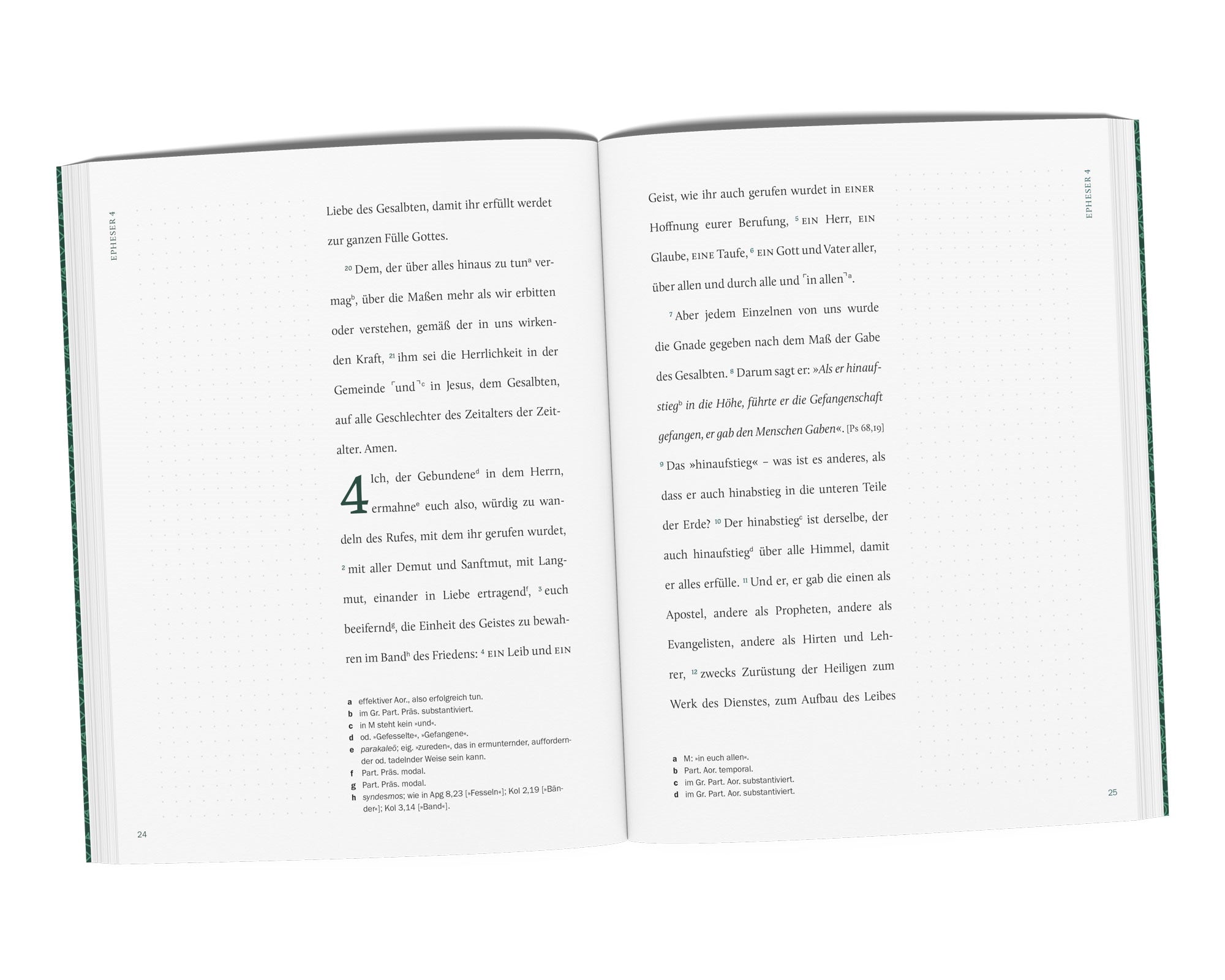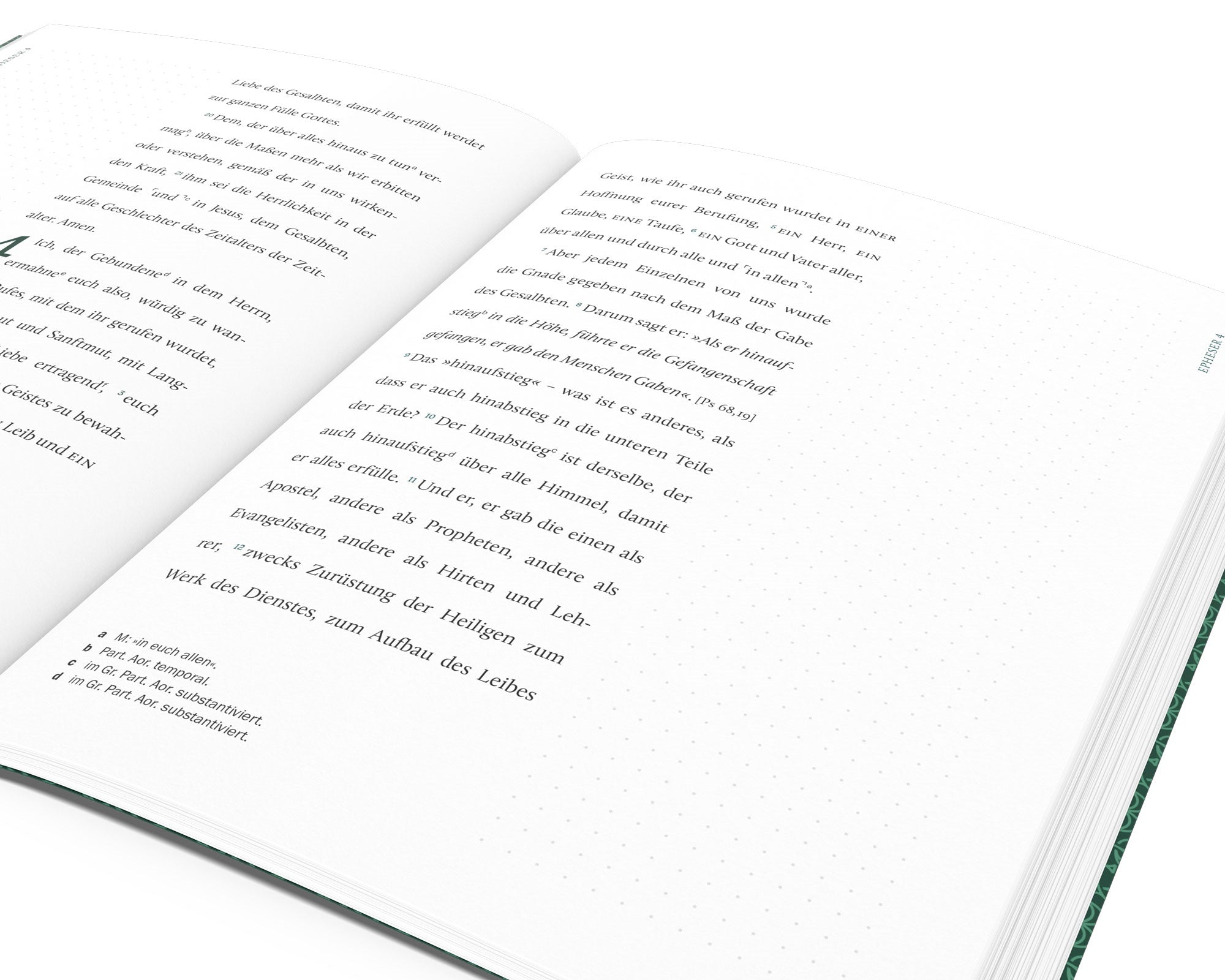 Dieses Logbuch dient dazu, den Gedankengang des biblischen Autors zu erforschen und nachzuvollziehen. Der Bibeltext ist mit besonders großem Zeilenabstand und Seitenrand abgedruckt. Der Platz zwischen den Zeilen und der Seitenrand ist dafür gedacht, Textbeobachtungen festzuhalten. Ob Verben, Bindewörter, Wiederholungen, Namen, Gegensätze oder Orte - ob bunte Markierungen, Pfeile oder eingekreiste Wörter - in den Logbüchern hat der Leser Platz, um den Bibeltext gründlich zu erforschen. Passend dazu wurde eine besondere Buchbindung gewählt, damit man das Buch optimal aufschlagen kann. Das spezielle Papier ist mit einer Vielzahl von Stiften und Markern beschreibbar, ohne dass die Farbe auf die nächste Seite durchdrückt. Somit hat der Leser die Freiheit, fast jeden Stift zu nutzen, um Markierungen und Anmerkungen im Bibeltext zu machen.