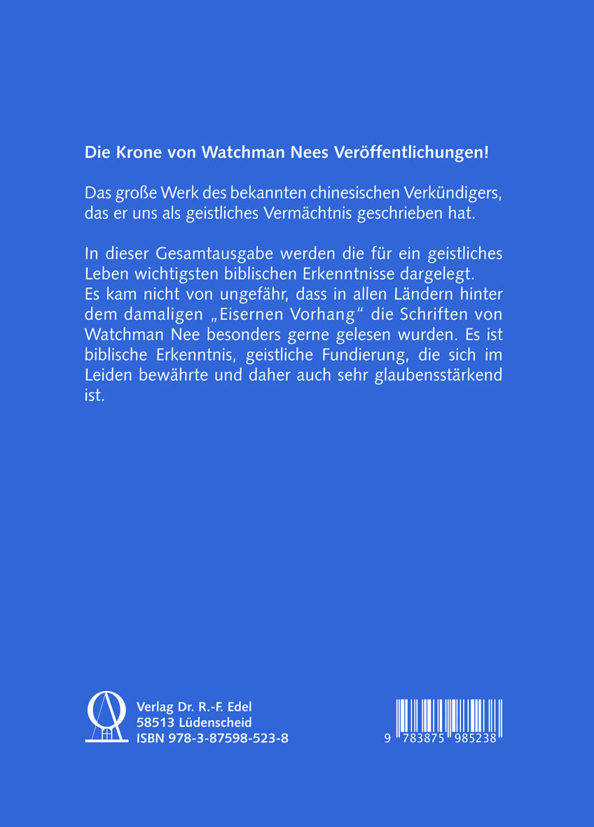 Das große Werk des bekannten chinesischen Verkündigers, das er uns als geistliches Vermächtnis geschrieben hat. In dieser Gesamtausgabe werden die für ein geistliches Leben wichtigsten biblischen Erkenntnisse dargelegt. Es kam nicht von ungefähr, dass in allen Ländern hinter dem damaligen "Eisernen Vorhang" die Schriften von Watchman Nee besonders gerne gelesen wurden. Es ist biblische Erkenntnis, geistliche Fundierung, die sich im Leiden bewährte und daher auch sehr glaubensstärkend ist.