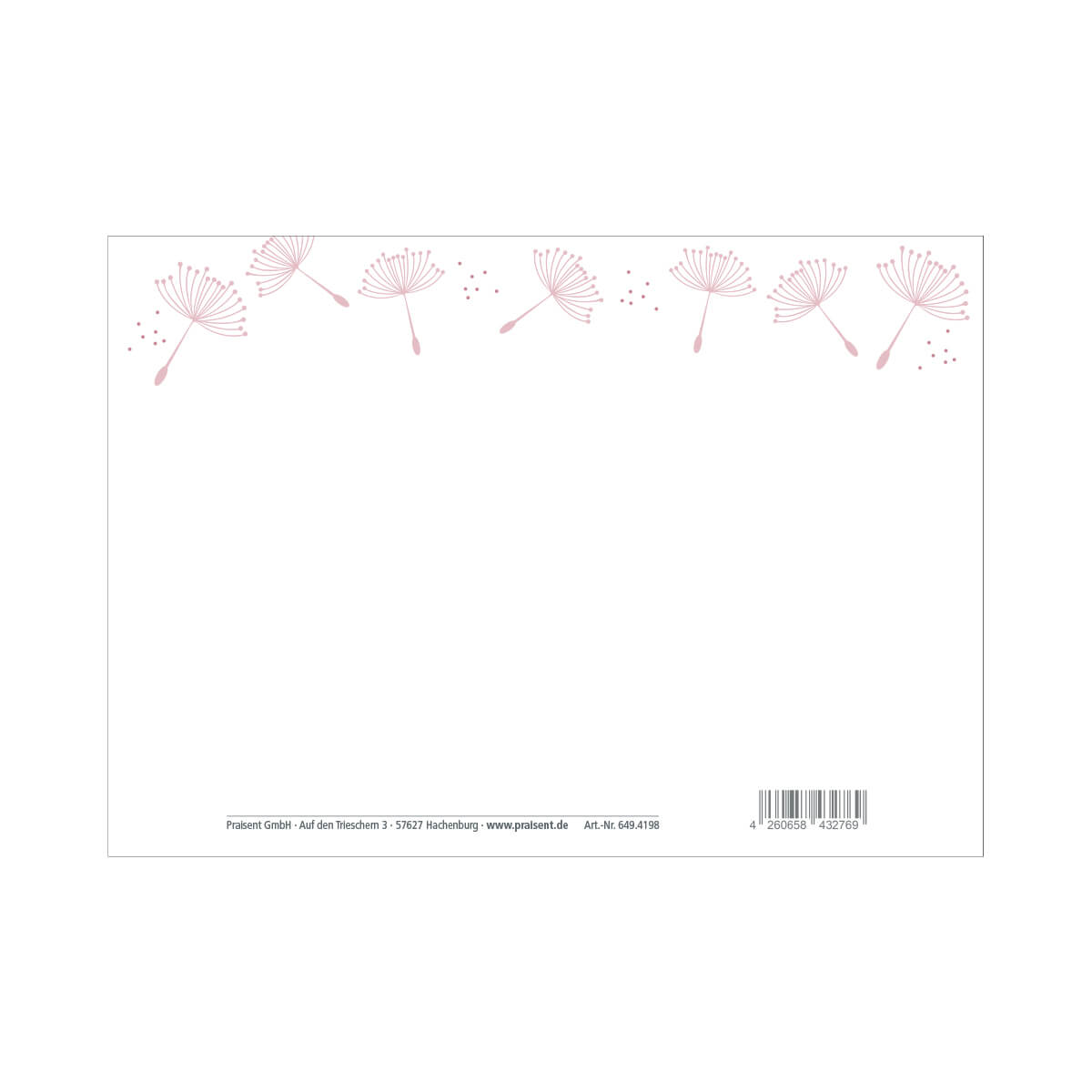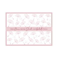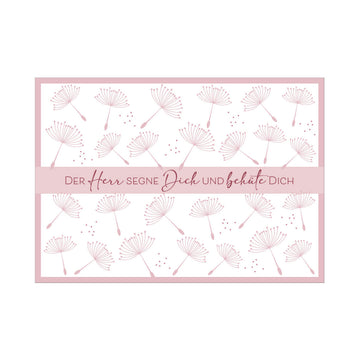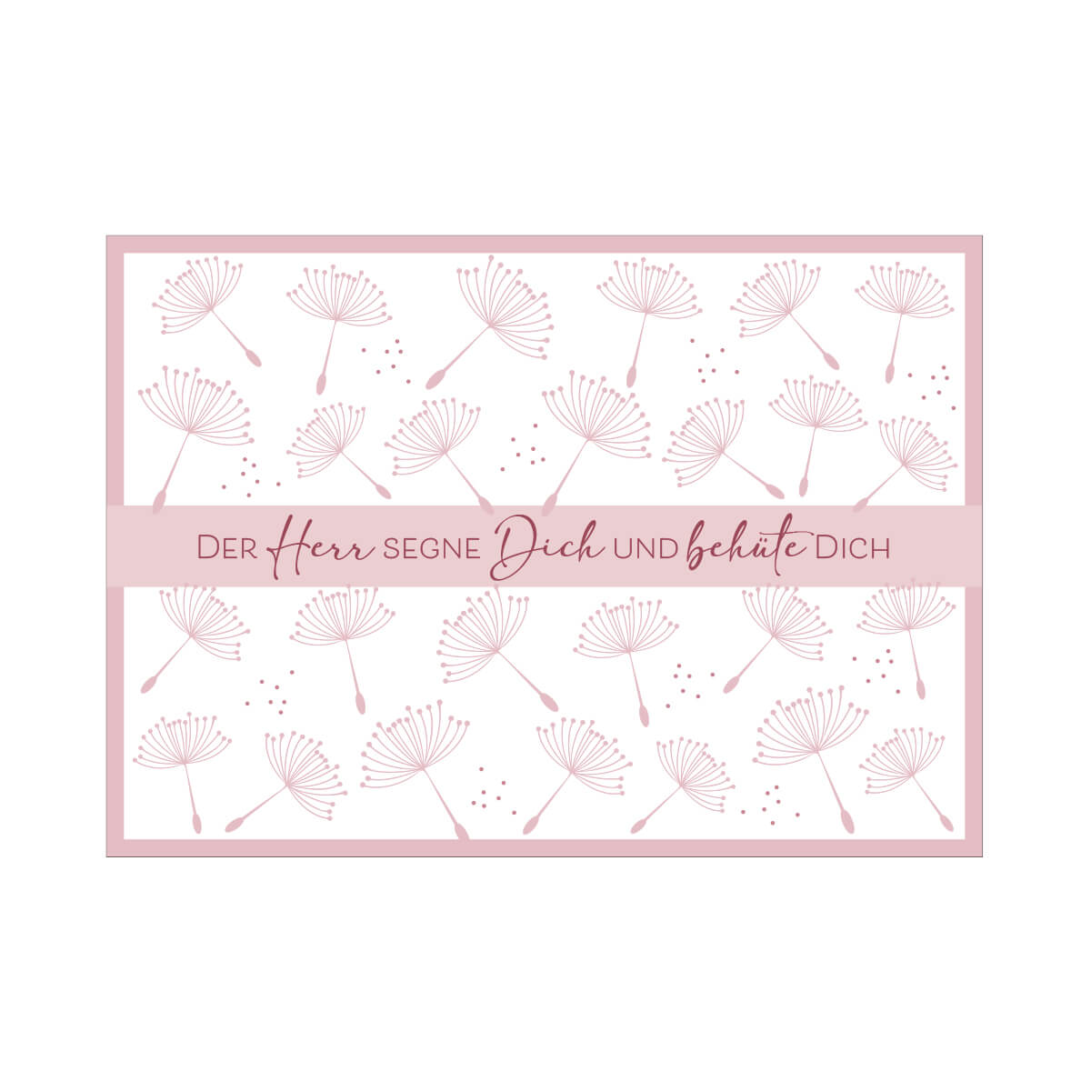 Edle Postkarte Pusteblume mit schönem rosefarbenen Design und Spruch: "Der Herr segne dich und behüte dich".
