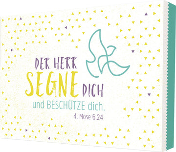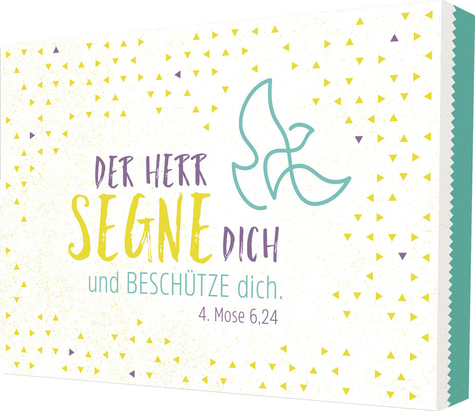 Ein Segensspruch, den man gern an Konfirmanden oder Firmlinge verschenkt. Das Bild in frischen Farben wurde auf einen dreidimensionalen MDF-Block aufgebracht. Es steht von allein sicher im Regal oder auf der Bilderleiste, dank integriertem Haken auf der Rückseite ist es auch schnell aufgehängt.