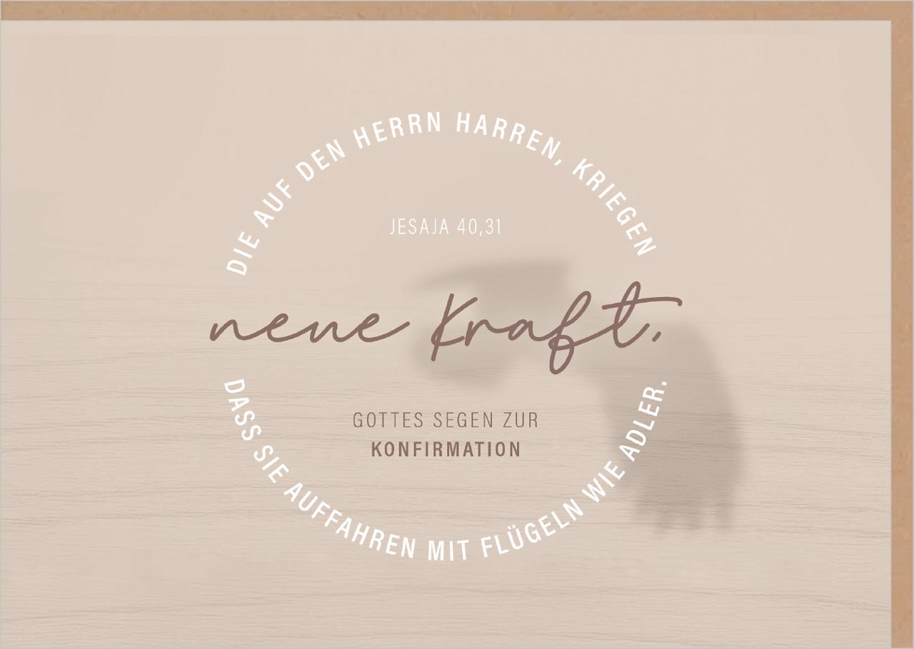 Der Schatten eines Vogels ergänzt das Design und unterstreicht die Botschaft von Stärke und Hoffnung. Innerhalb des Kreises ist die Versangabe Jesaja 40,31 sowie die Aufschrift "Gottes Segen zur Konfirmation" platziert.