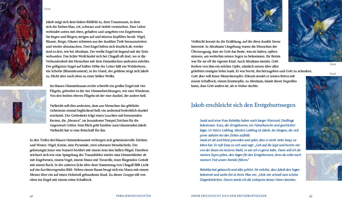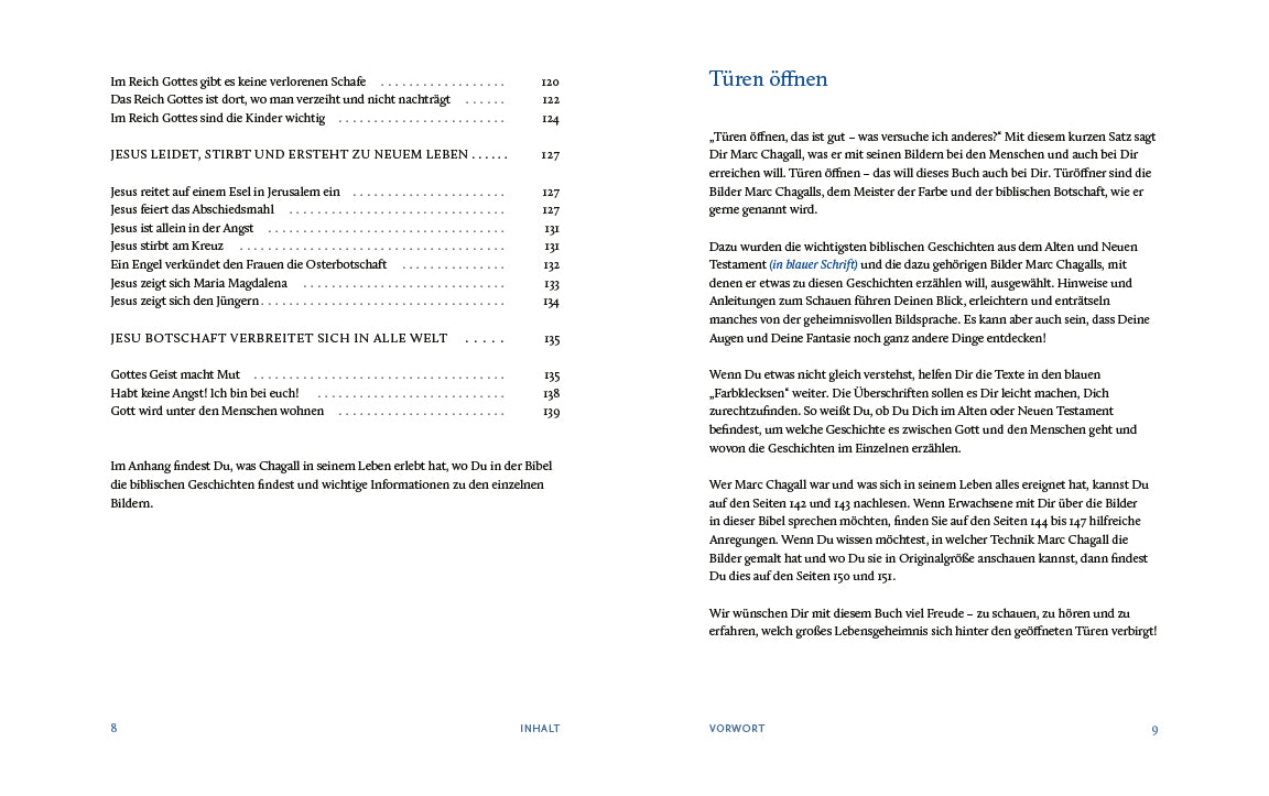 Bibel und Kunst für Kinder: 64 biblische Erzählungen mit rund 120 farbenfrohen Bildern von Marc Chagall. Der beliebte Kinderbuchklassiker enthält die schönsten Erzählungen aus dem Alten und Neuen Testament. Die in kindgerechter Sprache nacherzählten Geschichten werden jeweils mit einem großformatigen Bild von Chagall illustriert. Bildausschnitte zeigen interessante Details und Erläuterungen entschlüsseln die faszinierende Bildsprache Chagalls. Ein bebilderter Anhang enthält eine Einführung in das Werk Chagalls, eine kurze Biografie und ein Register zu den gezeigten Bildern. Alle Texte sind für Kinder ab 10 Jahren gut verständlich und spannend zu lesen. Dieses Buch bietet Kindern einen anschaulichen Zugang zur Bibel sowie zu Chagalls Bildern.