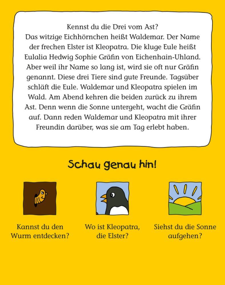 Mit diesem außergewöhnlichen Malbuch können schon die Kleinsten auf spielerische Weise die Abenteuer der 3 vom Ast entdecken. Dieser Titel enthält fünf Entdecker-Bilder mit kleinen Suchaufgaben und jeweils einer kurzen Vorlesegeschichte. Hier lernen Kinder Waldemar, Kleopatra und die gräfliche Eule kennen und erfahren, wie gut Gott sich um alle Tiere kümmert. Die Geschichten stammen aus unterschiedlichen Episoden der Hörspiel-Sammelbox. Der Wasser-Überraschungs-Pinsel lässt sich dazu immer wieder neu mit Wasser auffüllen.