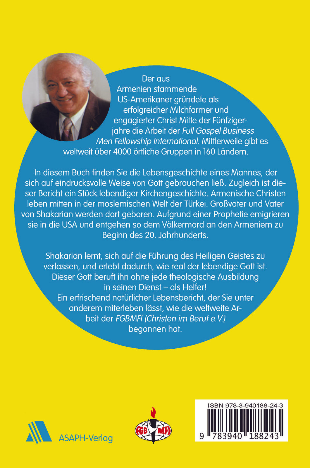 Hier berichtet der Gründer von "Christen im Beruf" (FGBMFI), der aus Armenien stammende US-Amerikaner, erfolgreicher und engagierter Christ - wie Gott in seiner großen Liebe mit ihm Geschichte schrieb, ein im Wortsinn wunderbarer und menschenverliebter Gott-Vater, der rettet, heilt und wirkt. Daneben ist es ein Stück lebendige Kirchengeschichte. Armenische Christen leben mitten in der moslemischen Welt der Türkei. Großvater und Vater von Shakarian werden dort geboren. Aufgrund einer Prophetie emigrieren sie in die USA und entgehen so dem Türkenmassaker.