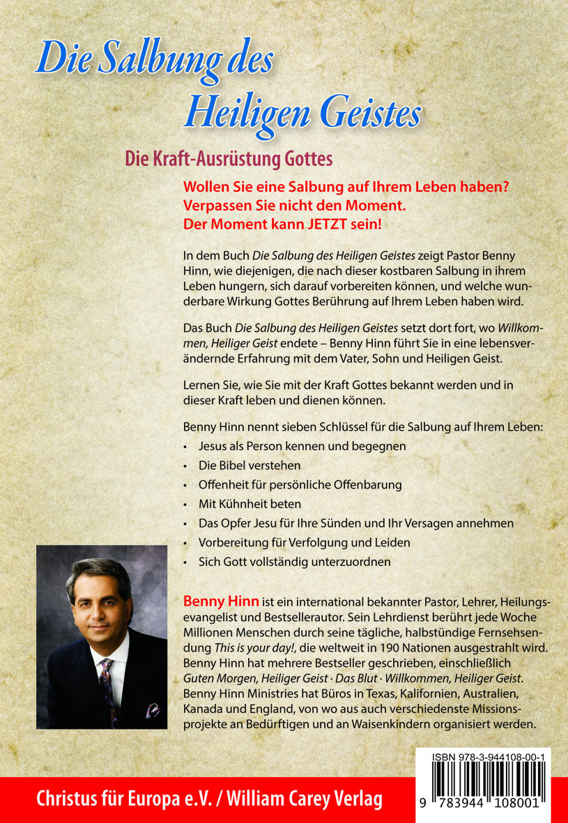 In diesem Buch beschreibt der Autor die Wichtigkeit der Salbung des Heiligen Geistes für das Leben und den Dienst eines jeden Christen. Die Salbung ist die Kraft Gottes, Seine Werke tun zu können. Benny Hinn beschreibt anhand der ganzen Bibel die Wirkungsweise der Salbung, sowie den Preis, den wir zahlen müssen, um ein Leben in der Salbung Gottes führen zu können. Nichts braucht die Gemeinde Jesu dringender. Das Buch enthält einen Studienteil nach jedem Kapitel für Einzel- oder Gruppenstudium.