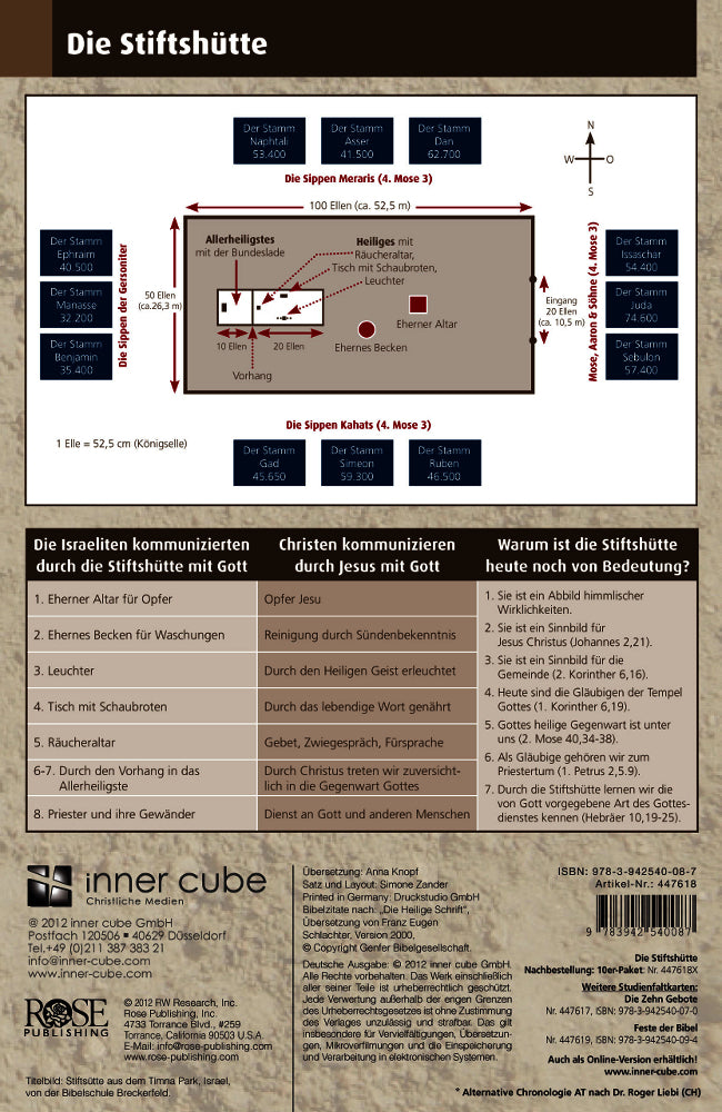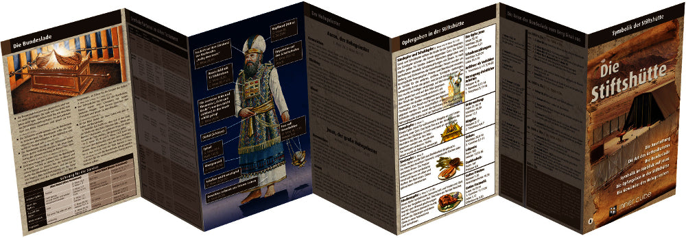 Wer die umfangreichen und hoch detaillierten Pläne zum Bau und zum Betrieb der Stiftshütte die Gott Mose offenbarte in der Bibel nachliest der erahnt dass dieser mobilen zeltartigen Konstruktion eine immense Bedeutung zukommt. Die Studienfaltkarte erschließt dem Leser wie die Stiftshütte aufgebaut war welchen Zwecken sie diente was sich dort ereignete - und was dies alles zu bedeuten hat. Die Stiftshütte kommuniziert die Wahrheit Gottes und seinen Heilsplan. Der spätere Tempel und dann vor allem das Leben und die Lehren Jesu Christi greifen dies alles wieder auf. Christus bringt es schließlich zur Erfüllung.