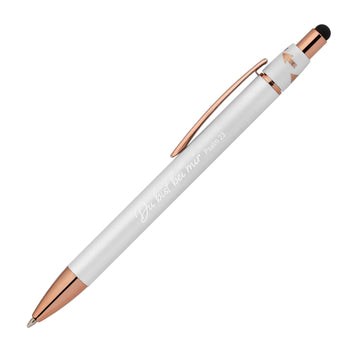 Der Kuli zeichnet sich durch seine pfiffige Drehfunktion aus, verziert mit roségoldfarbenen Pfeilen. Die in gleicher Farbe gehaltenen Verzierungen und die luxuriöse Gummibeschichtung verleihen dem Kuli einen eleganten Touch.