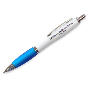 Jeden Menschen gibt es nur ein einziges Mal auf dieser Welt, denn ,Du bist ein Gedanke Gottes" (Ps 139,13-16). Ein tiefsinniger Vers auf einem Kuli in leuchtender Farbe.