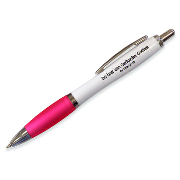 Jeden Menschen gibt es nur ein einziges Mal auf dieser Welt, denn ,Du bist ein Gedanke Gottes" (Ps 139,13-16). Ein tiefsinniger Vers auf einem Kuli in leuchtender Farbe.