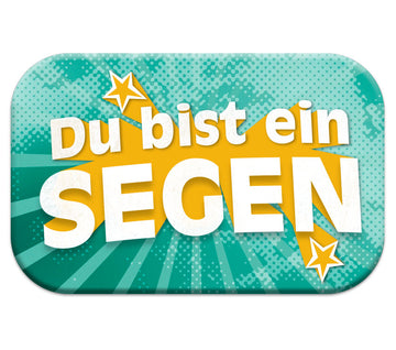 Der Magnet und ein farbiges Kärtchen mit Bibelzitat auf der Rückseite sind zusammen in einer Folie verpackt.