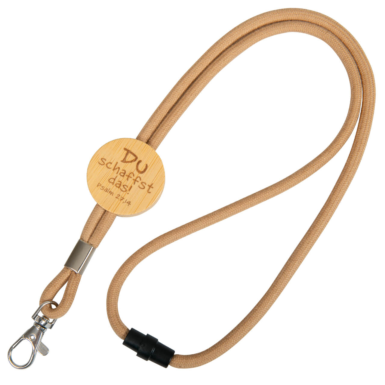 Praktisches Lanyard mit toller mutmachender Aussage: "Du schaffst das! Psalm 27.14" im Naturlook aus hochwertigen Materialien.