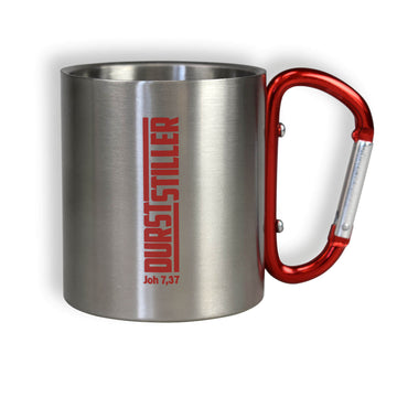 Tasse aus doppelwandigem Edelstahl, mit Karabiner als Griff, bedruckt mit "Durststiller - Joh 7,37".