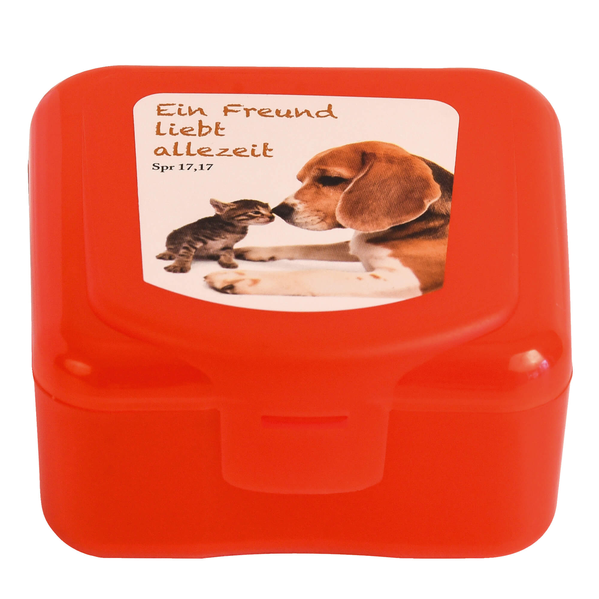 Die handlichen Boxen mit dem beliebten Hunde- und Katzen-Motiv und dem Aufdruck "Ein Freund liebt allezeit Spr 17,17" sind zu 100% lebensmittelecht, geruchsneutral, spülmaschinen- und mikrowellengeeignet bis 120 Grad, recycelbar und frei von Weichmachern.