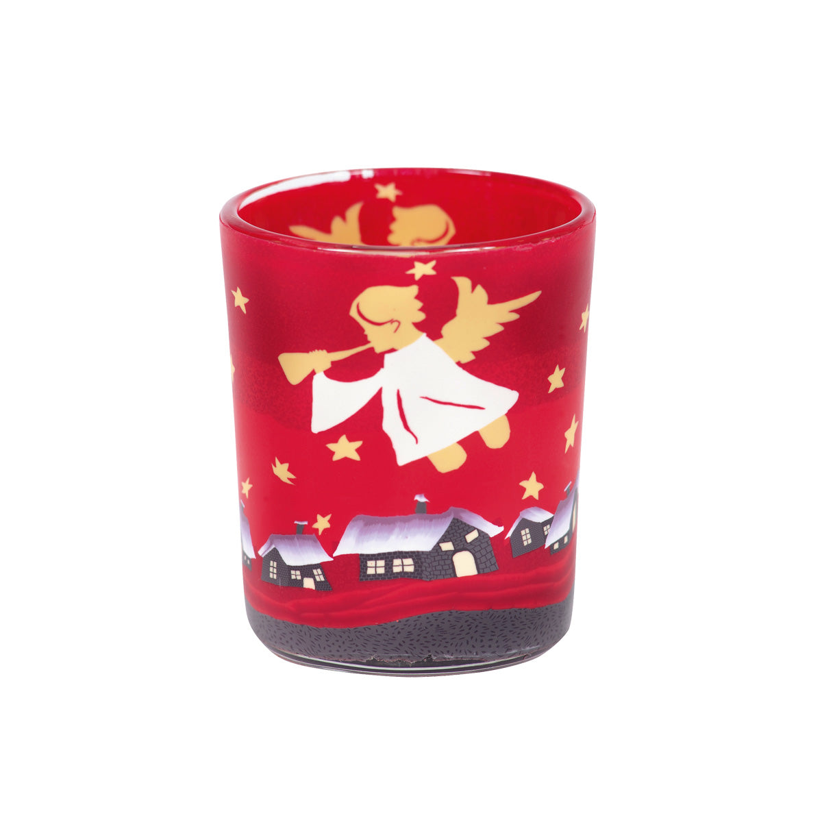 Engel mit Posaunen und viele Sterne "leuchten" über dem verscheiten Winterdorf. Dieses rote Votivglas schafft heimelige Atmosphäre an dunklen Wintertagen.