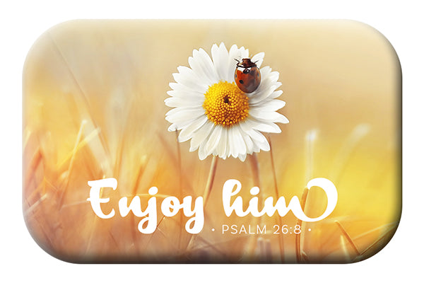 Der Magnet ist zusammen mit einem Minikärtchen in einer Folie verpackt. Auf der Vorderseite des Kärtchens ist das Motiv des Magneten zu sehen, auf der Rückseite befindet sich ein passendes Bibelzitat.