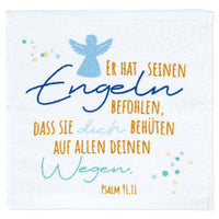 Kleines Handtuch in Engelform gepresst und verpackt, mit Text-Einleger: Gottes Engel für Dich.