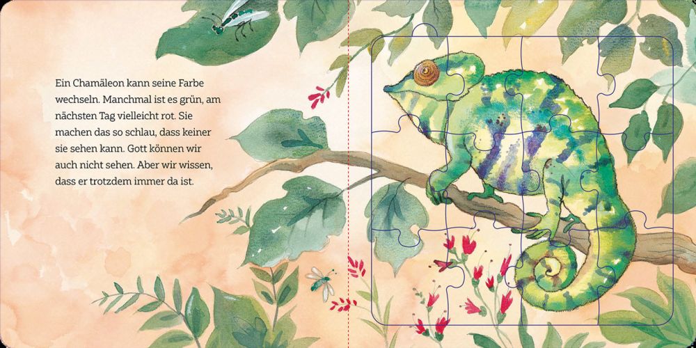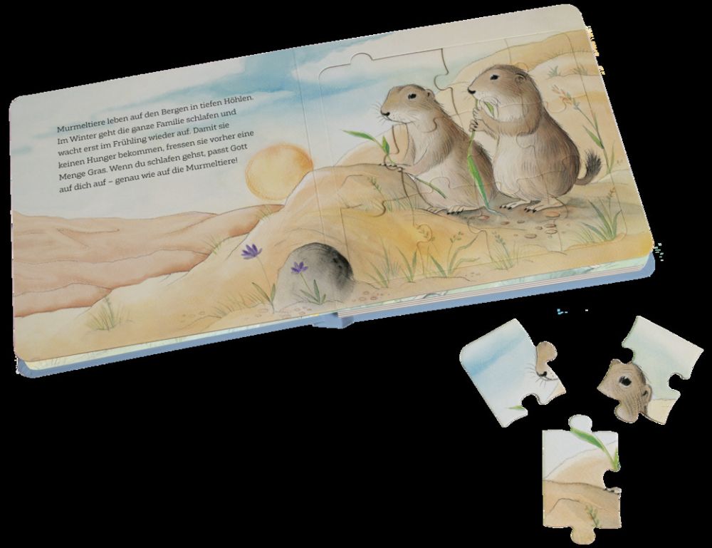 Fuchs und Faultier, Chamäleon und Känguru, Murmeltier und Eisbär haben ganz erstaunliche Fähigkeiten. Auf sechs Doppelseiten entdecken Puzzle-Fans, wie wunderbar Gott sich die Natur ausgedacht hat. Ganz nebenbei werden Motorik und Auge-Hand-Koordination gefördert. Und nicht zuletzt können schon die Kleinen von den Tieren einiges über Gott lernen!