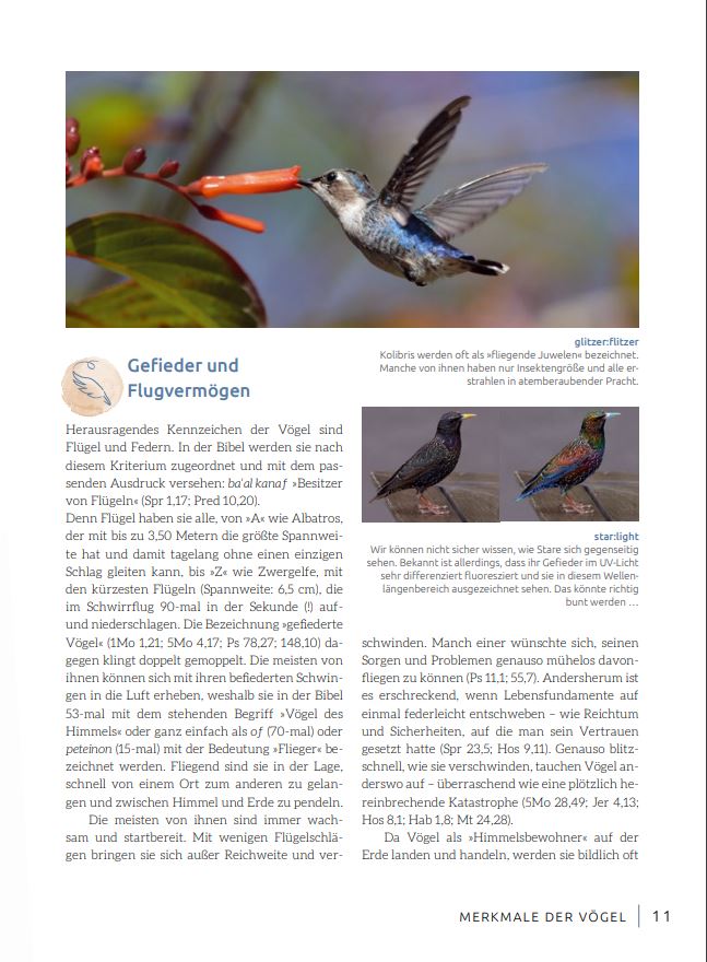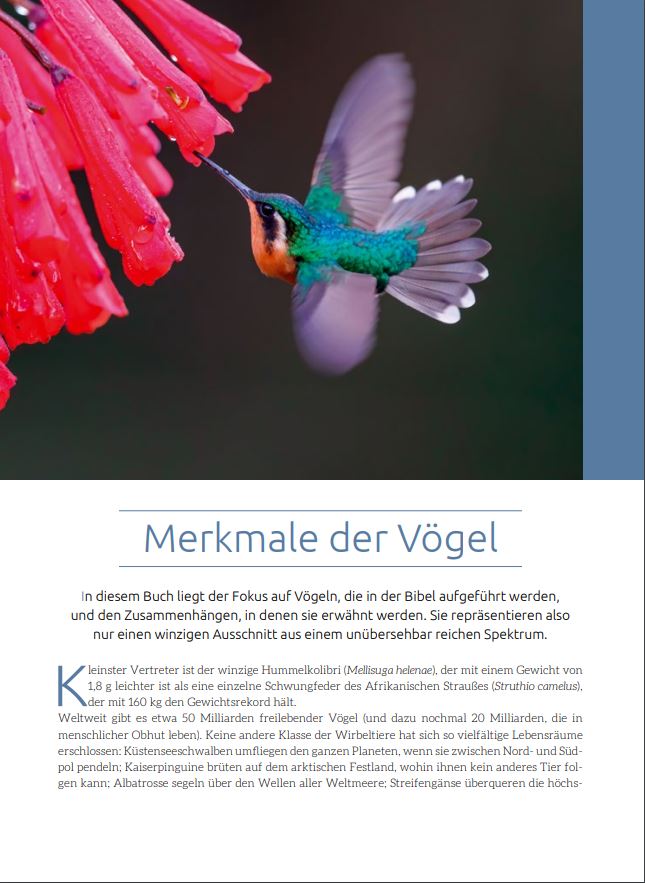 Wer sich diese Mühe macht, erkennt dabei nicht nur die Fürsorge und Weisheit Gottes, sondern wird auch staunen, wie treffend biblische Aussagen durch Vergleiche mit gefiederten Geschöpfen illustriert werden.