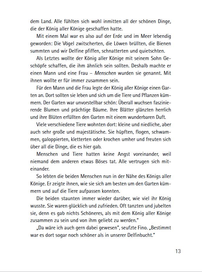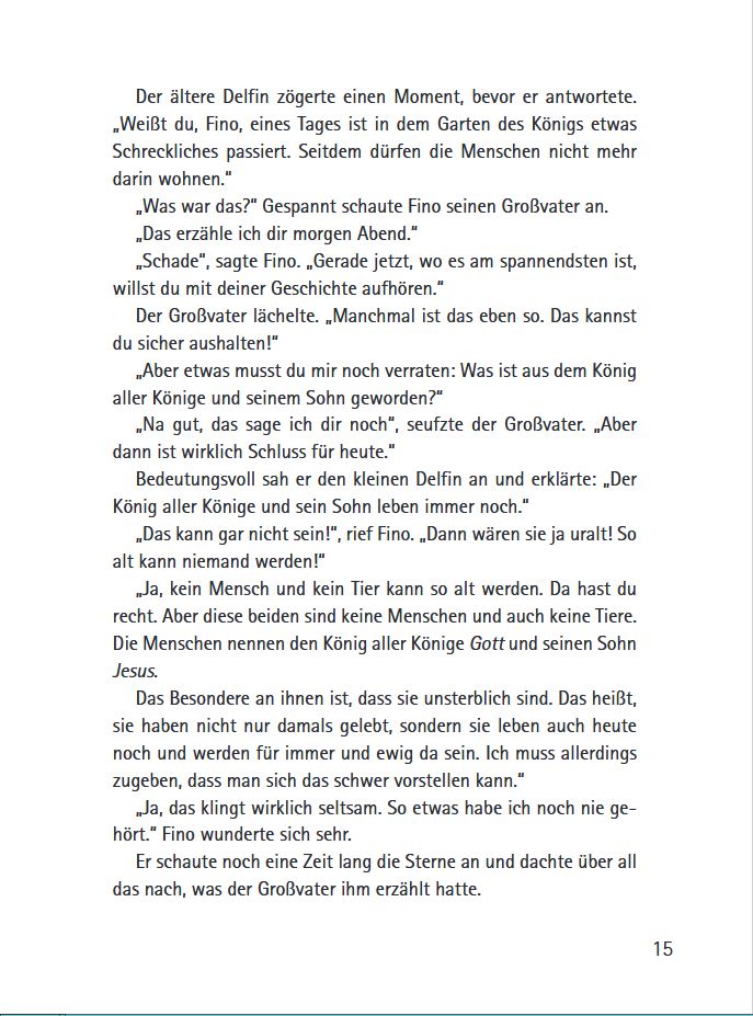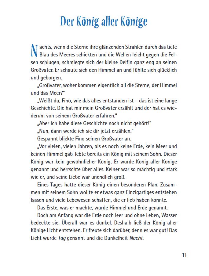 Jeden Abend greift Finos Opa die Erlebnisse und Fragen des kleinen Delfins auf und erzählt ihm von Gott. Von der Schöpfung über das Leben Jesu bis zum Ausblick auf Gottes neue Welt werden die zentralen Inhalte des Glaubens in einen Zusammenhang gestellt und kindgerecht erklärt.