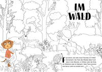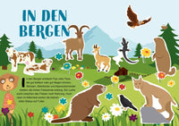Vervollständige die farbigen Doppelseiten mit den beiligenden Aufklebern und male die Ausmalseiten an.