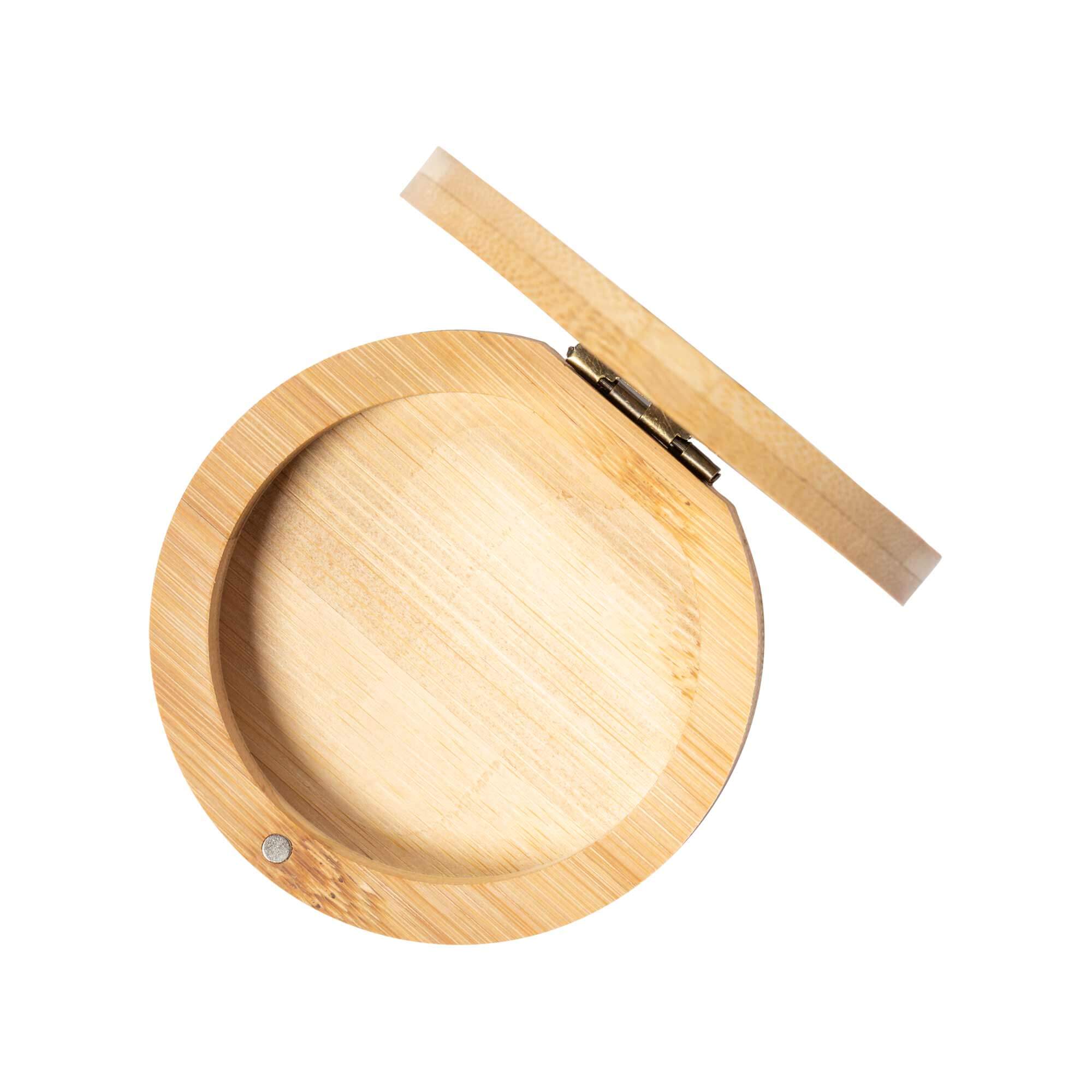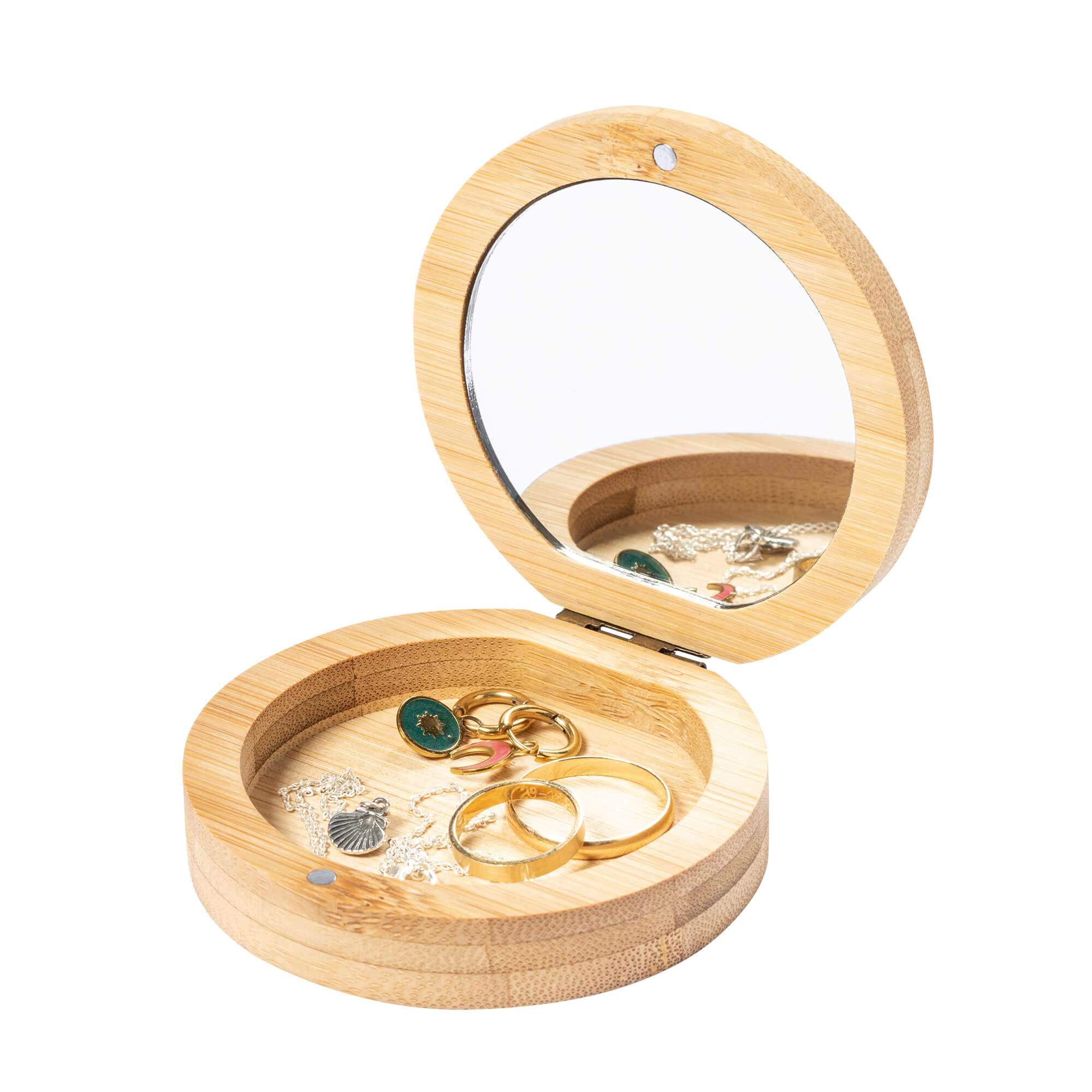 In der 8cm (Durchmesser) großen Dose aus Bambusholz sind kleinere Schmuckstück wie Ringe etc. sicher aufbewahrt. Praktisch: Im Deckelinneren befindet sich ein Spiegel.